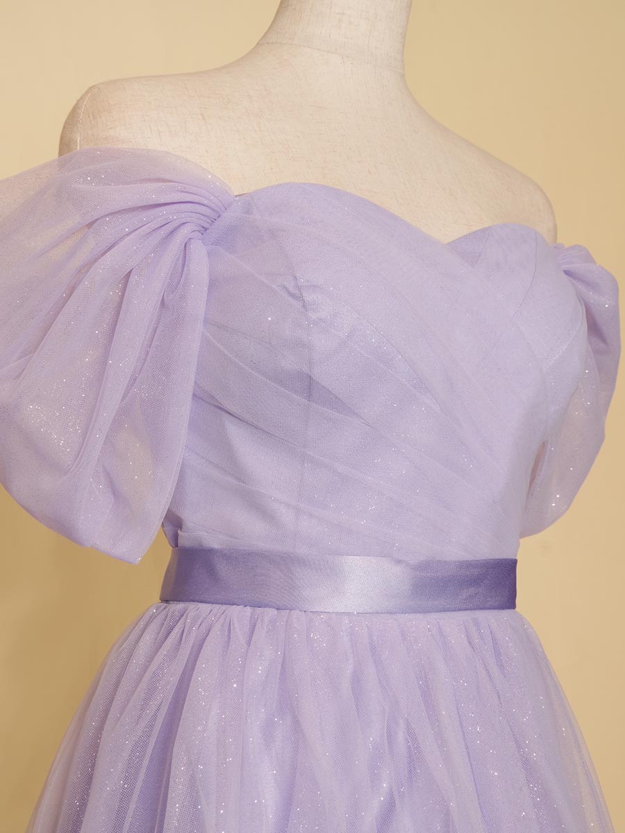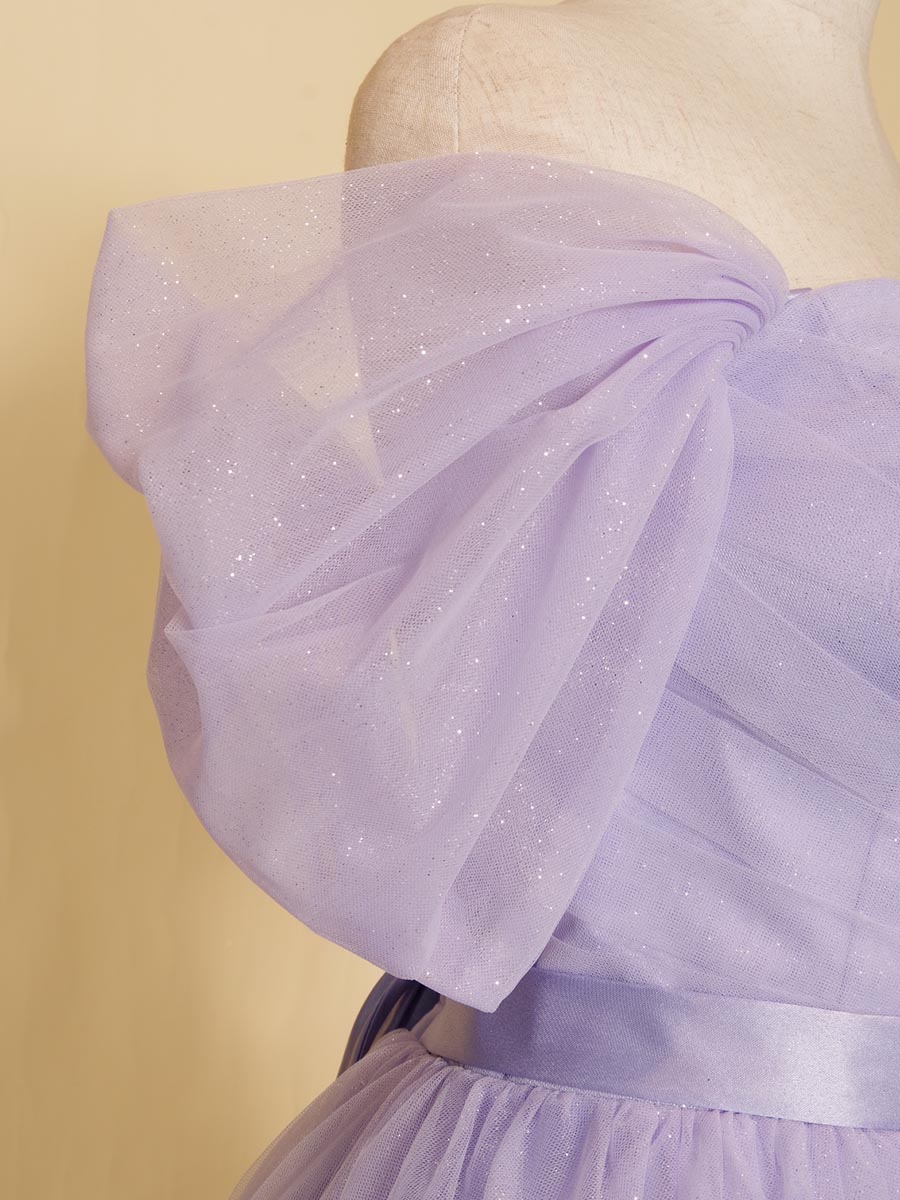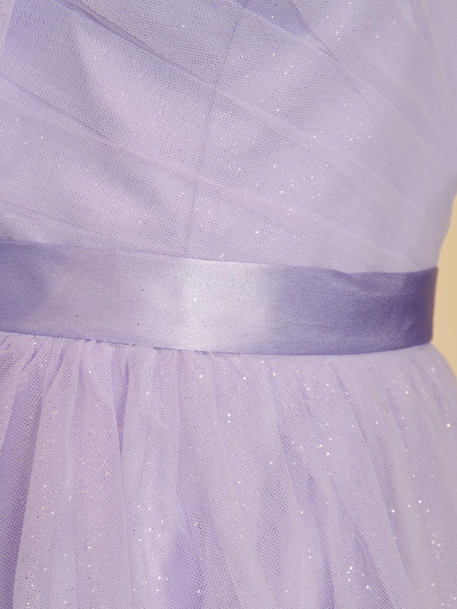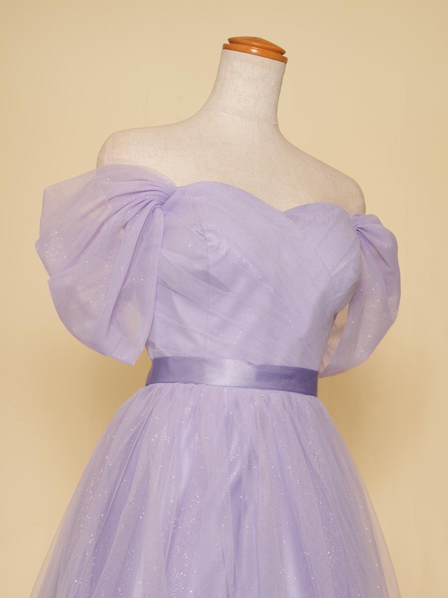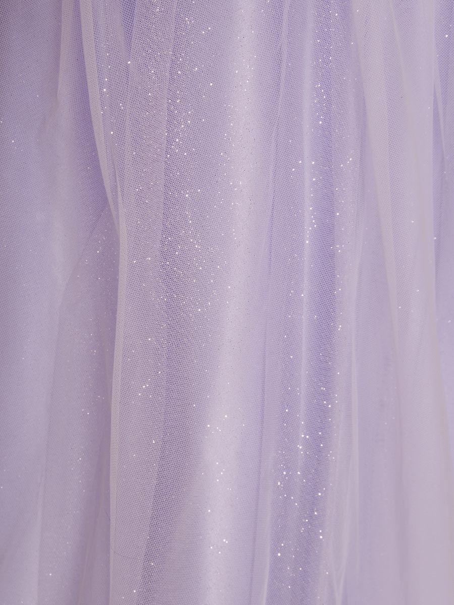キラキラのグリッターがライラック生地から反射することで、幻想的でファンタジーな印象の輝きをドレス全体から放ってくれます。