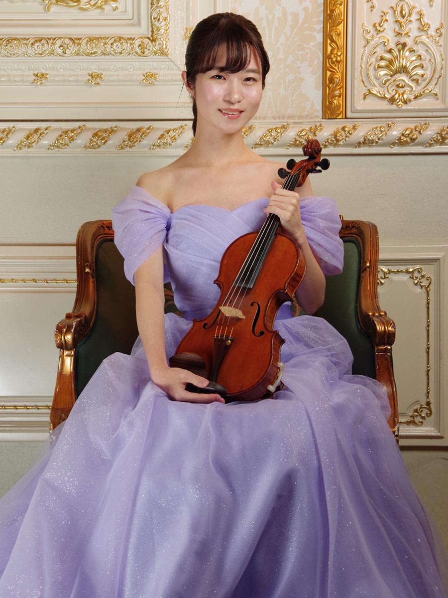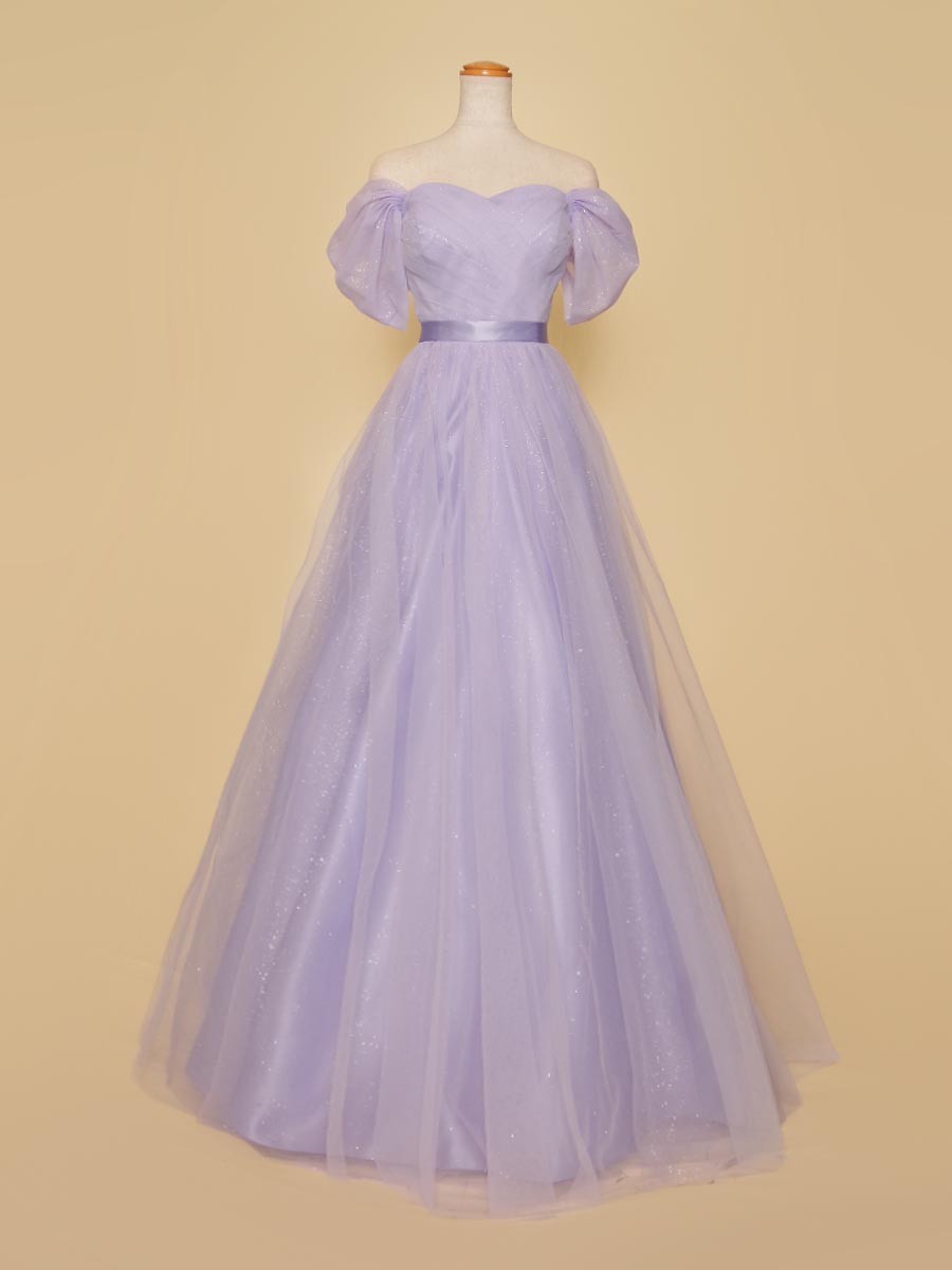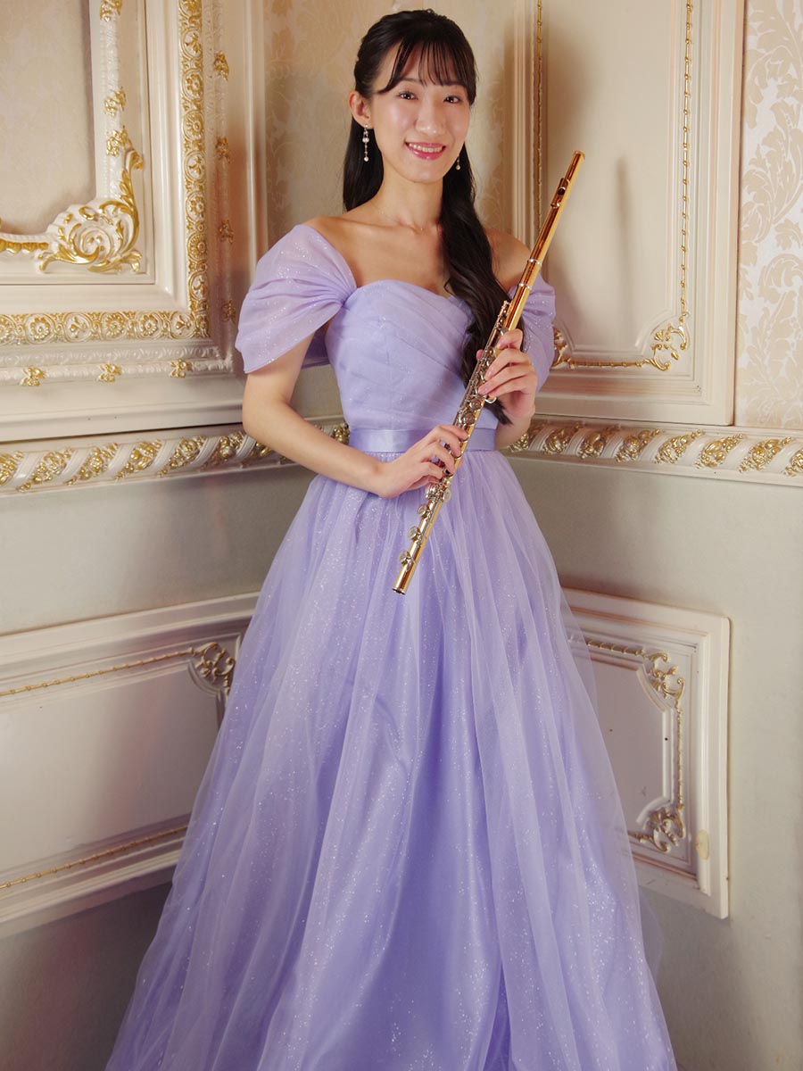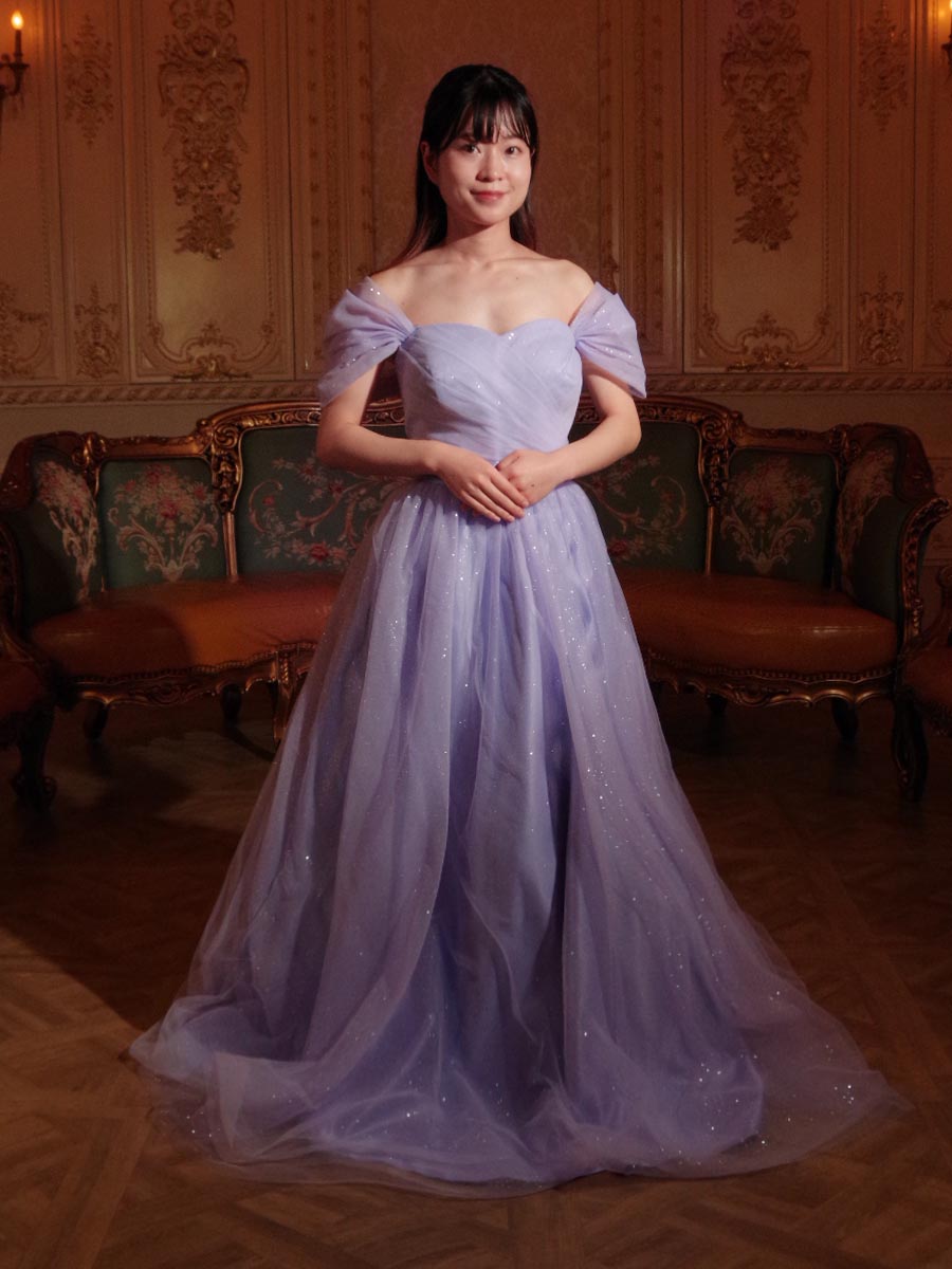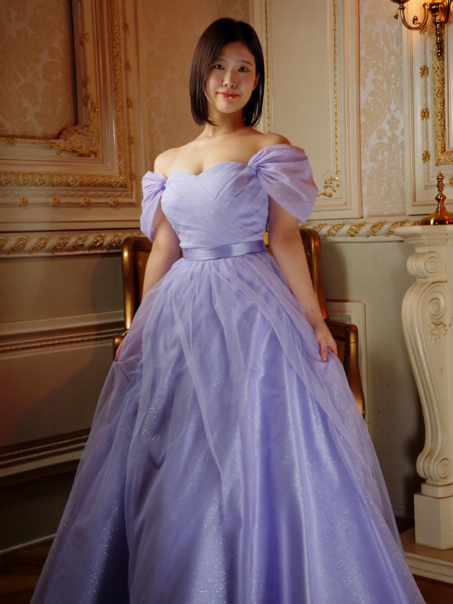 ふんわりとソフトな色合いのライラックカラーで仕上げたオフショルダーデザインのプリンセスラインシルエットの演奏会ドレス。
