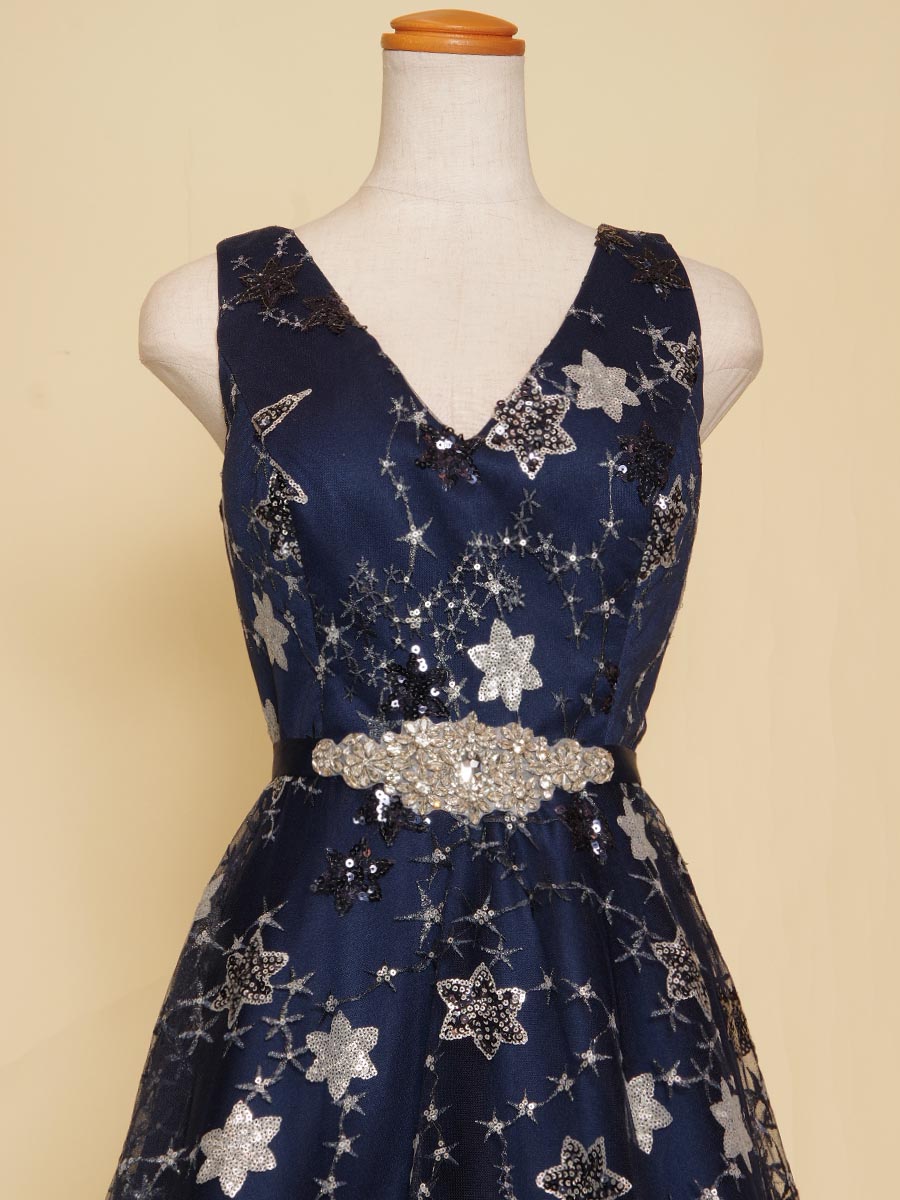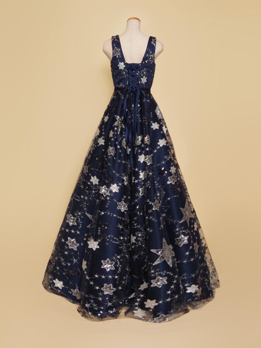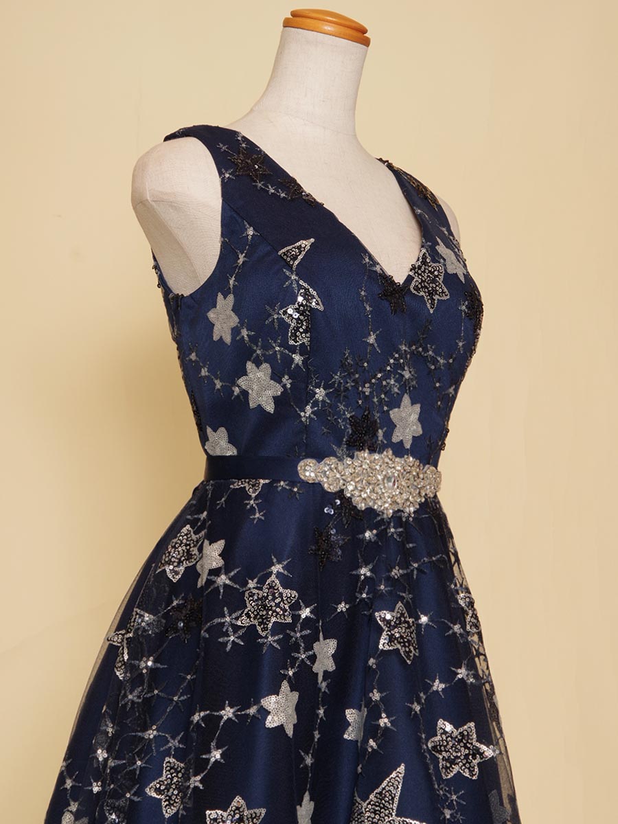 ネイビーの色合いにシルバー系の星座の刺繍が組み合わさることによって、モチーフがくっきりと浮き出させることによって、ドレス一着を夜空の様に美しく表現いたしました。