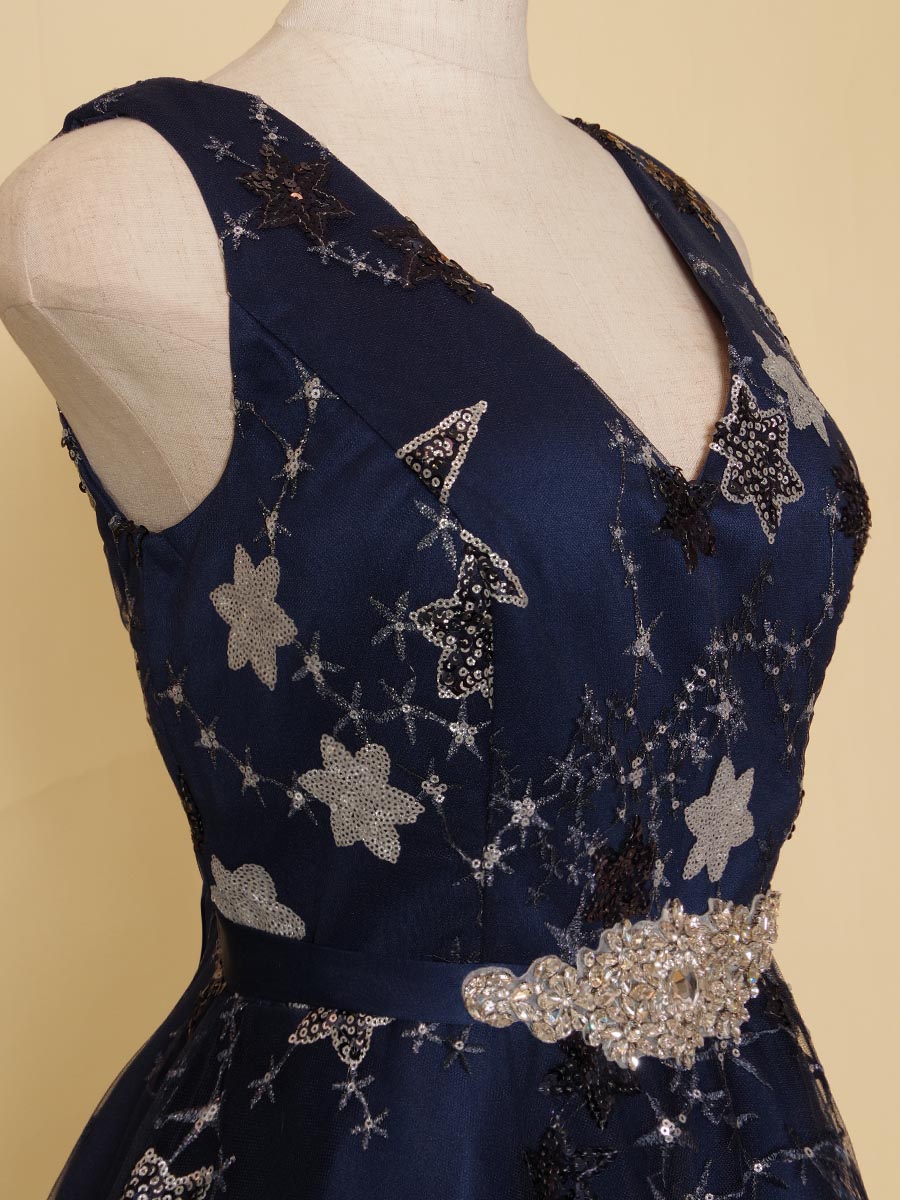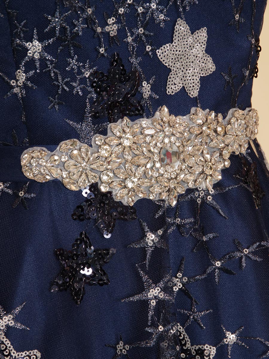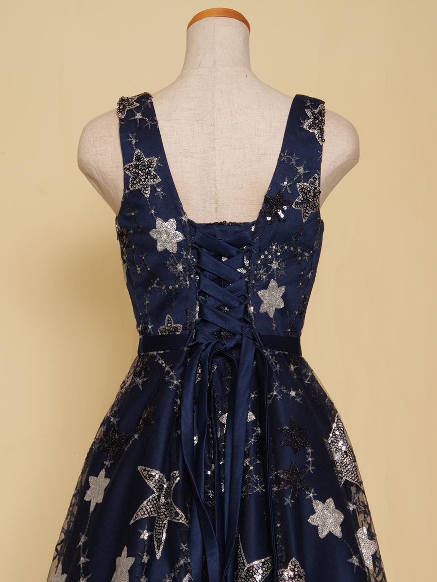 ネイビーの色合いにシルバー系の星座の刺繍が組み合わさることによって、モチーフがくっきりと浮き出させることによって、ドレス一着を夜空の様に美しく表現いたしました。