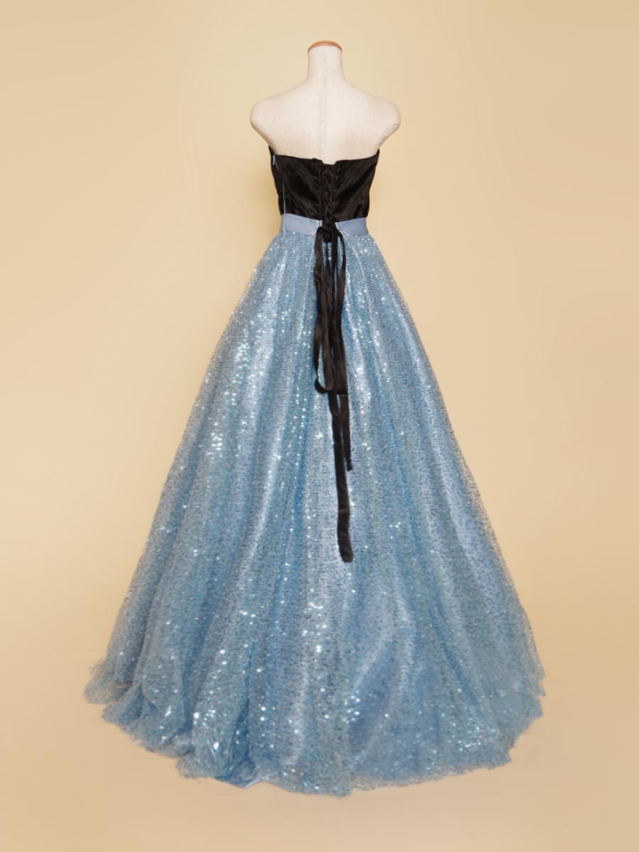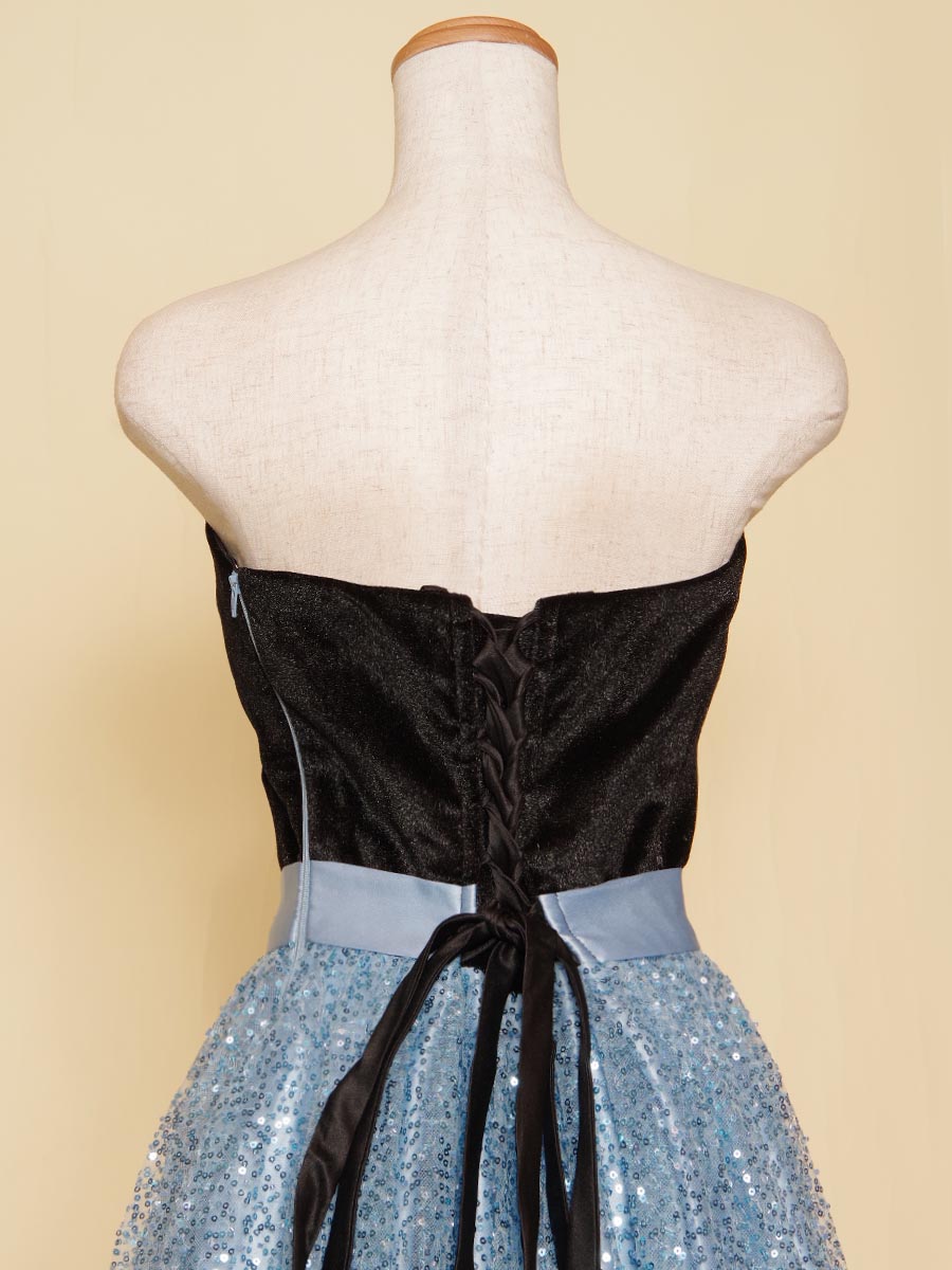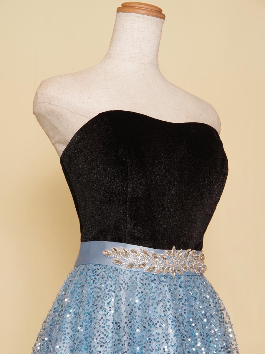 爽やかなスカイブルーのカラーリングのスパンコールスカートにブラックベロアトップを組み合わせたステージドレス。