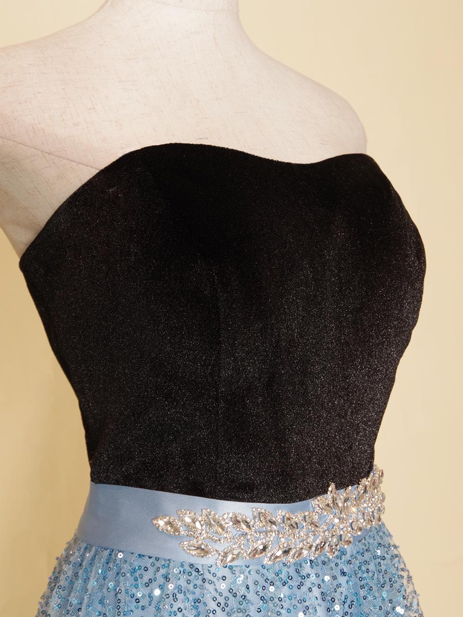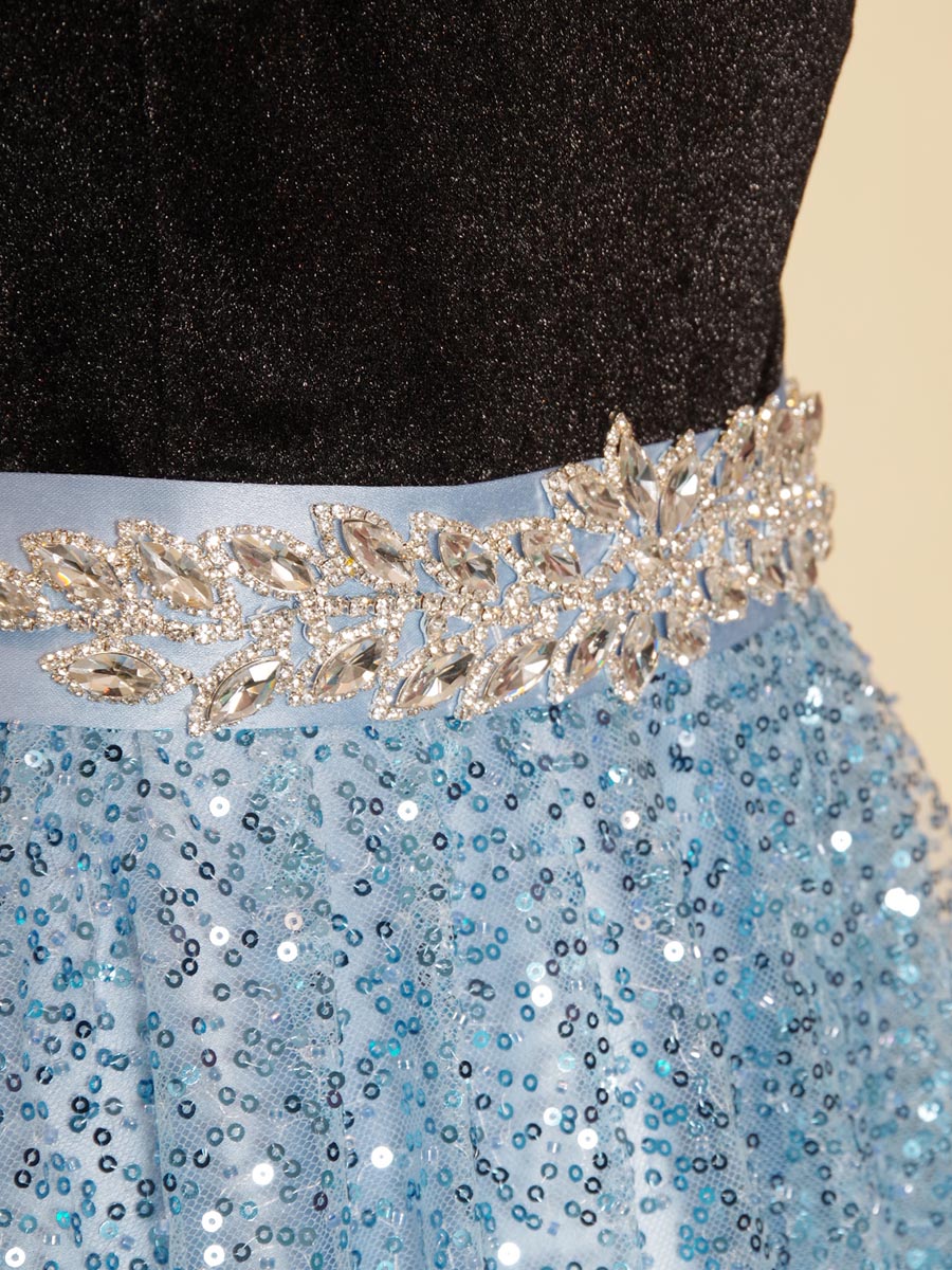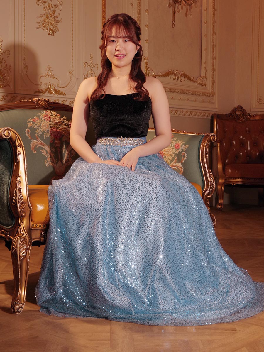 爽やかなスカイブルーのカラーリングのスパンコールスカートにブラックベロアトップを組み合わせたステージドレス。