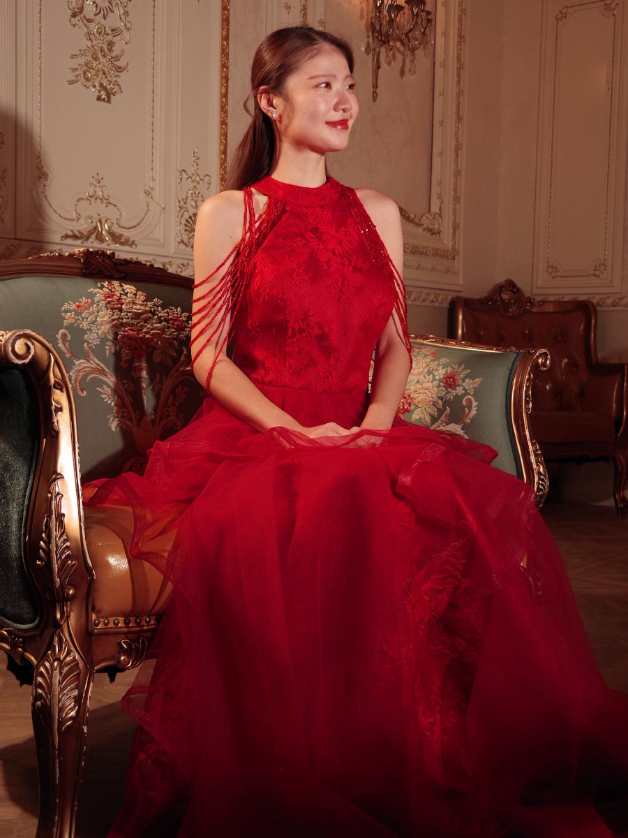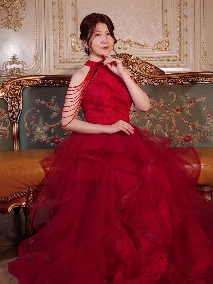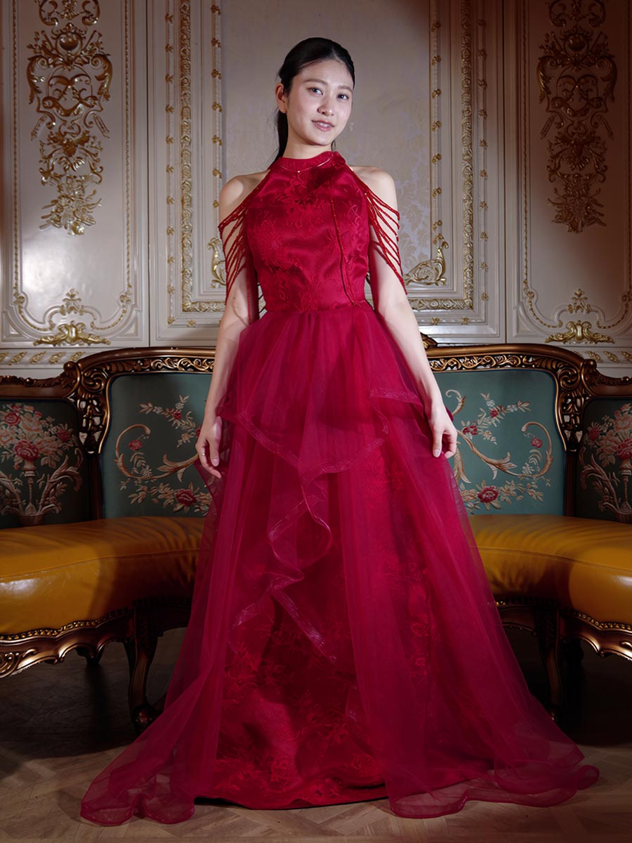 ワインレッドカラーをベースにしたフリルドレープスカートと肩部分にビーズの装飾を施した豪華さとスタイリッシュ感を兼ね備えた演奏会ロングドレス。