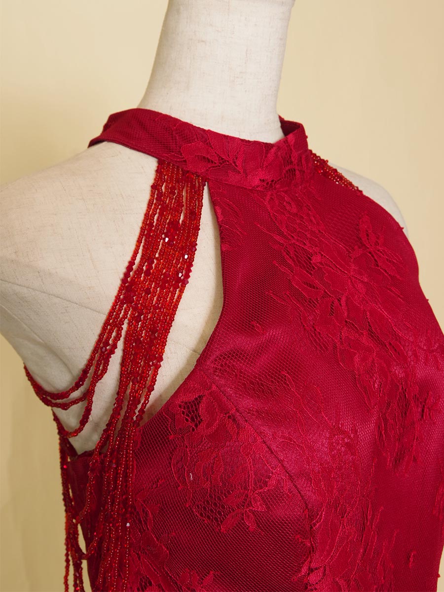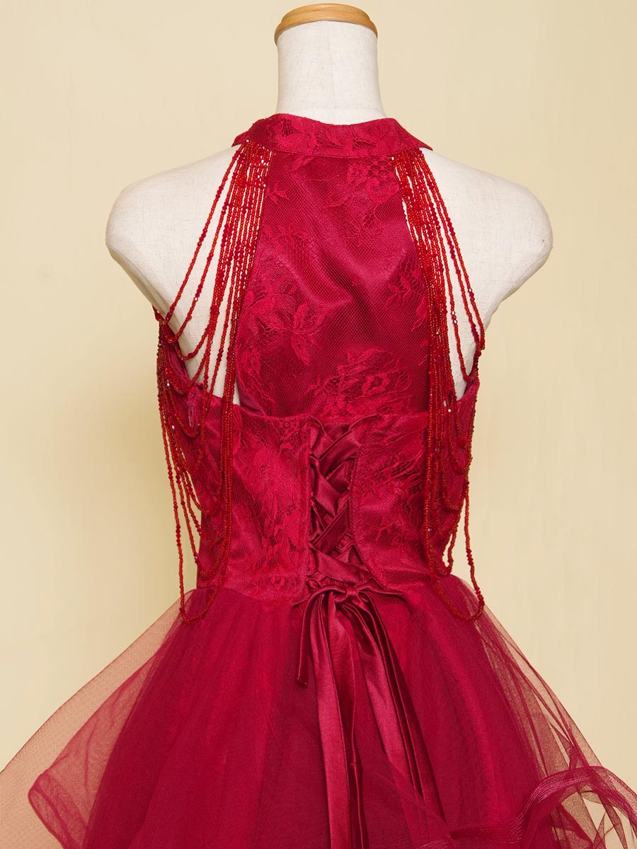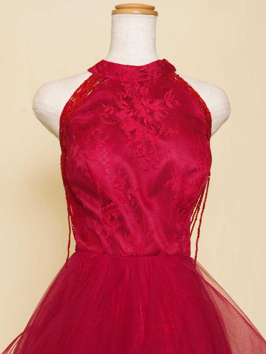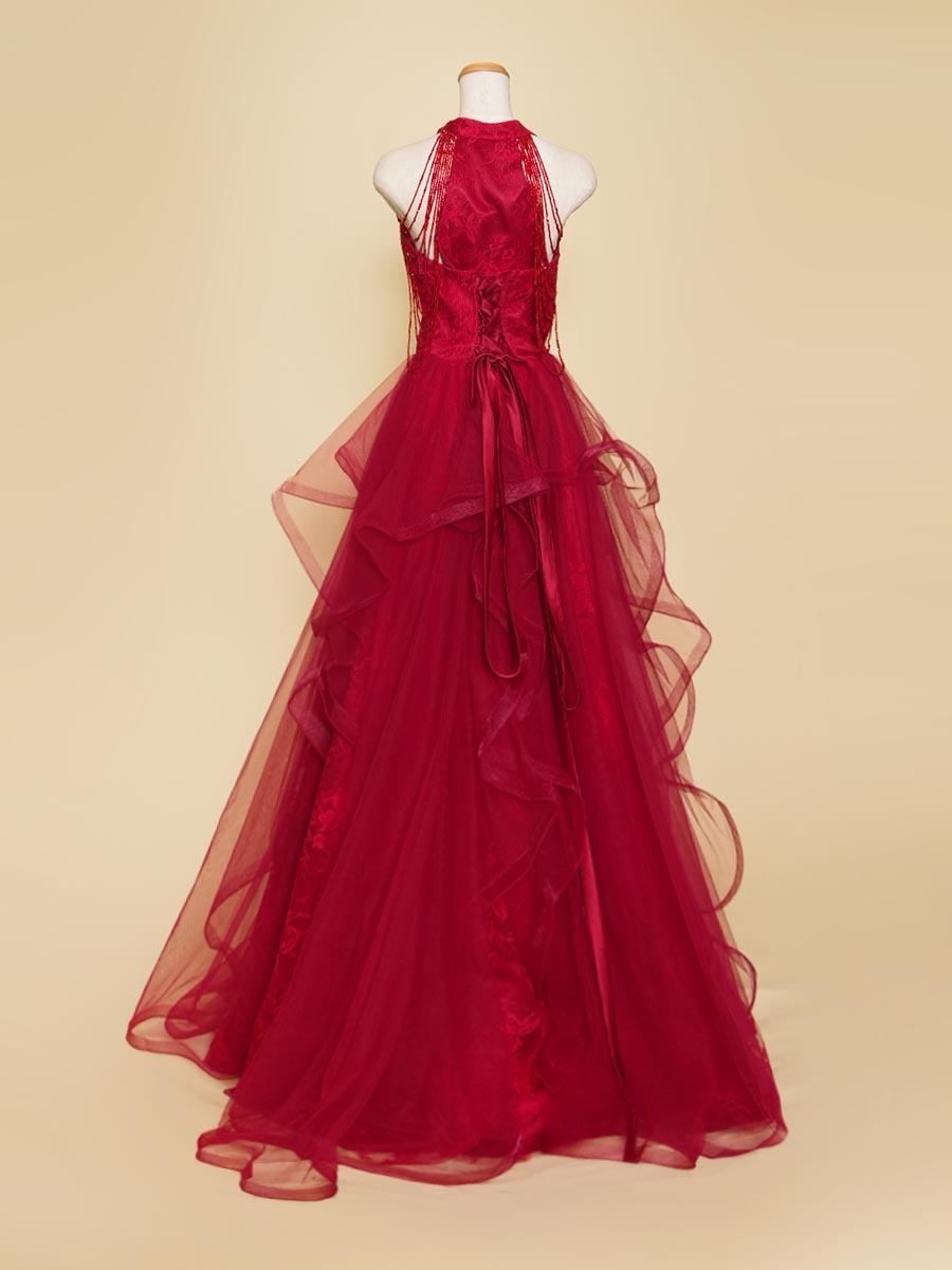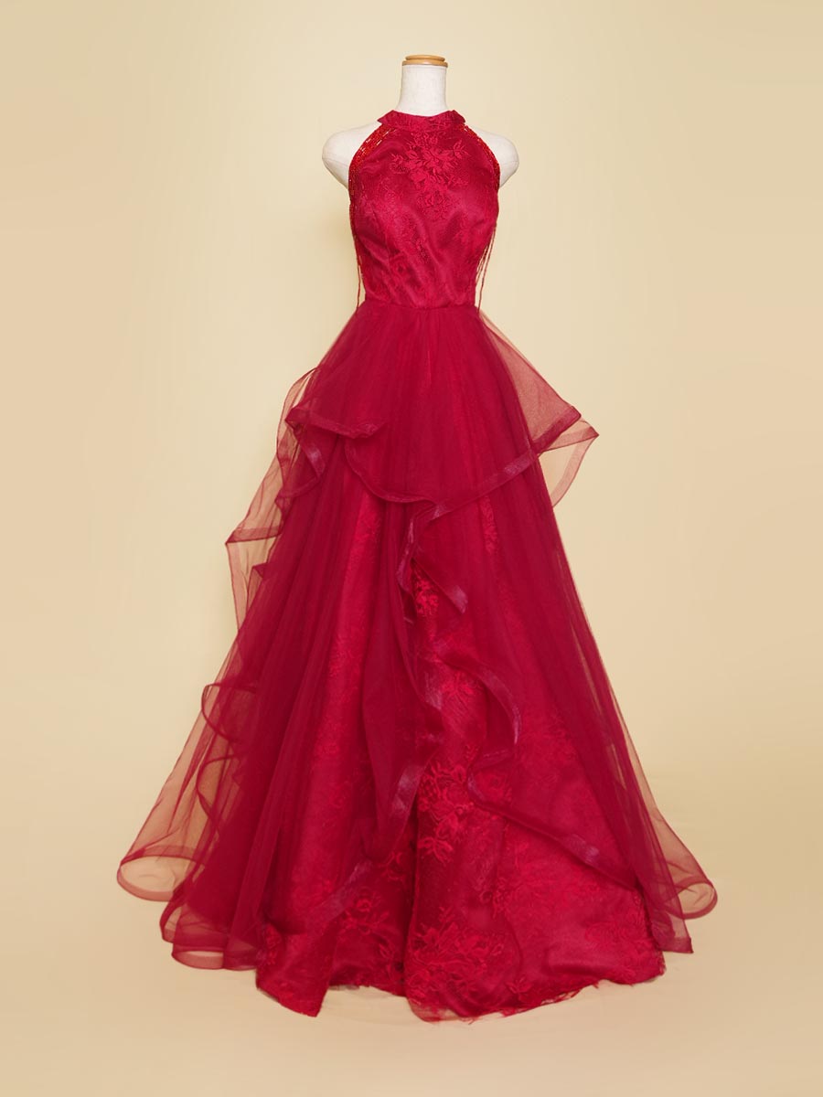 ワインレッドカラーのゴージャスホルターネックデザインの演奏会ロングドレス