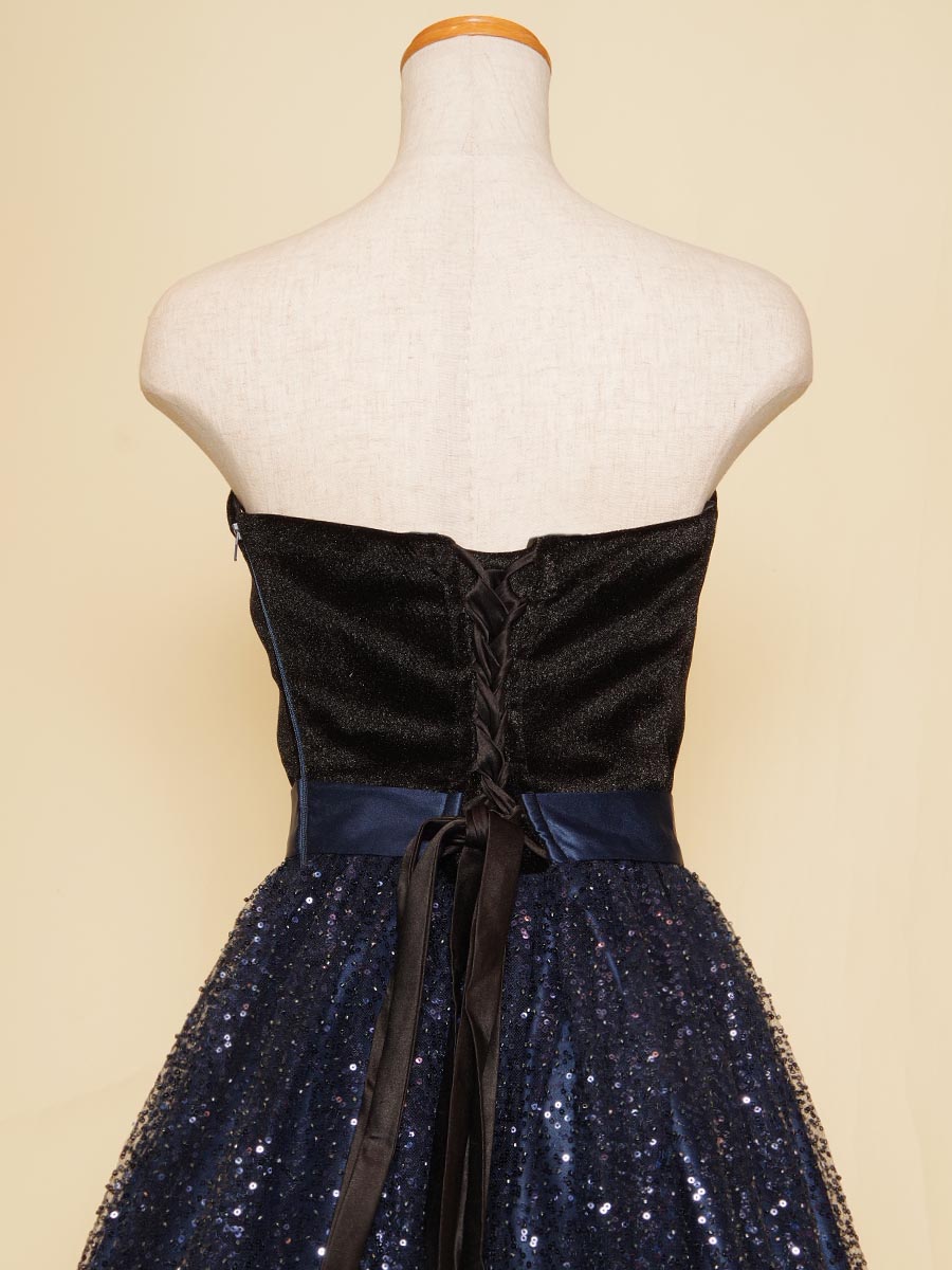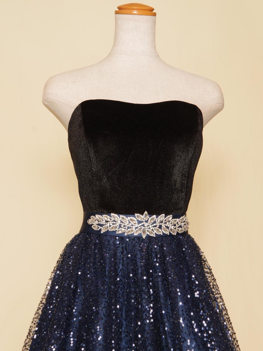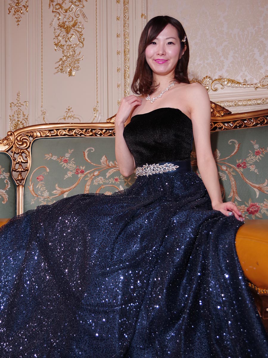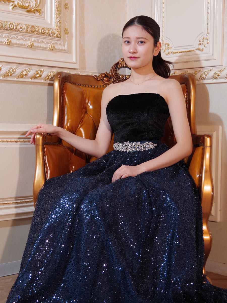 深みのあるネイビカラーにスパンコール装飾を施したスカートが大人っぽい上品で豪華な輝きを放ってくれる演奏会ドレス。