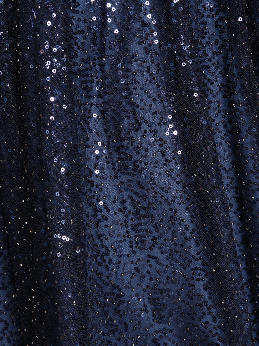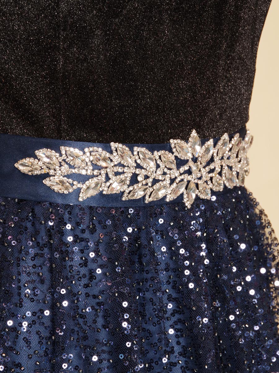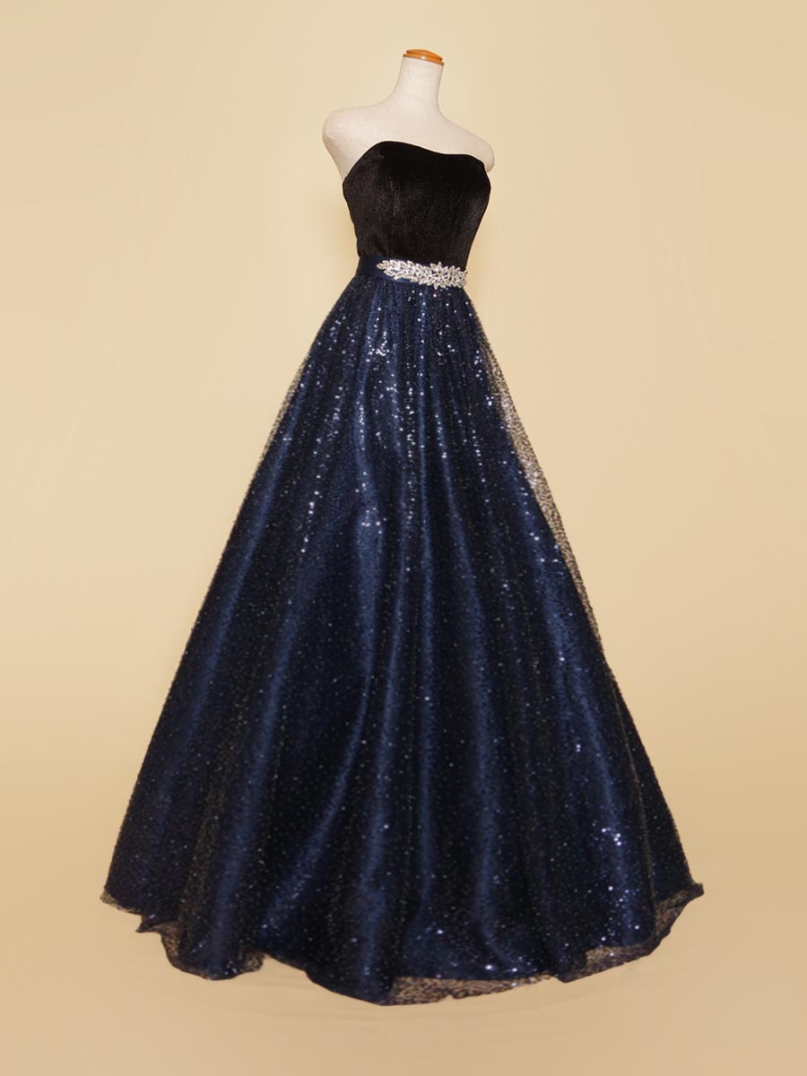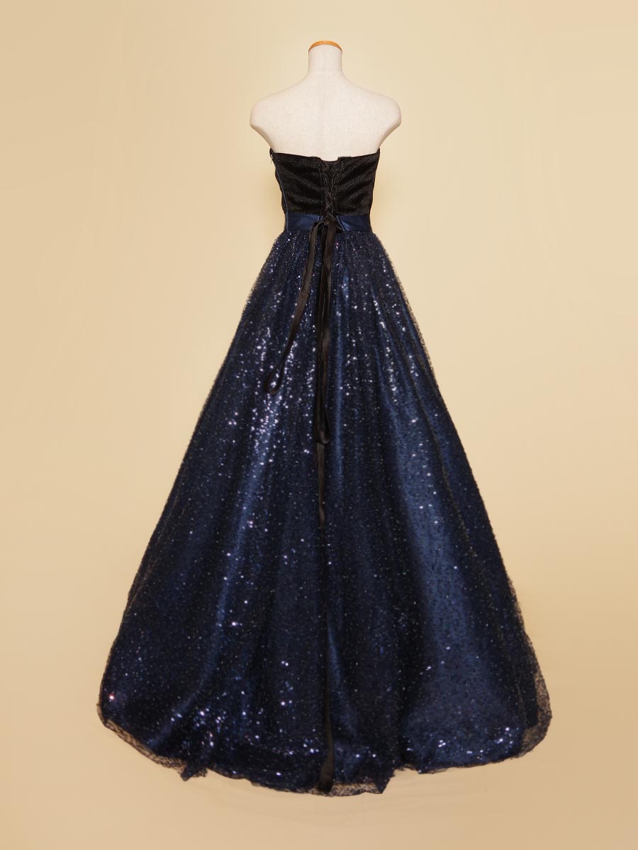 深みのあるネイビカラーにスパンコール装飾を施したスカートが大人っぽい上品で豪華な輝きを放ってくれる演奏会ドレス。