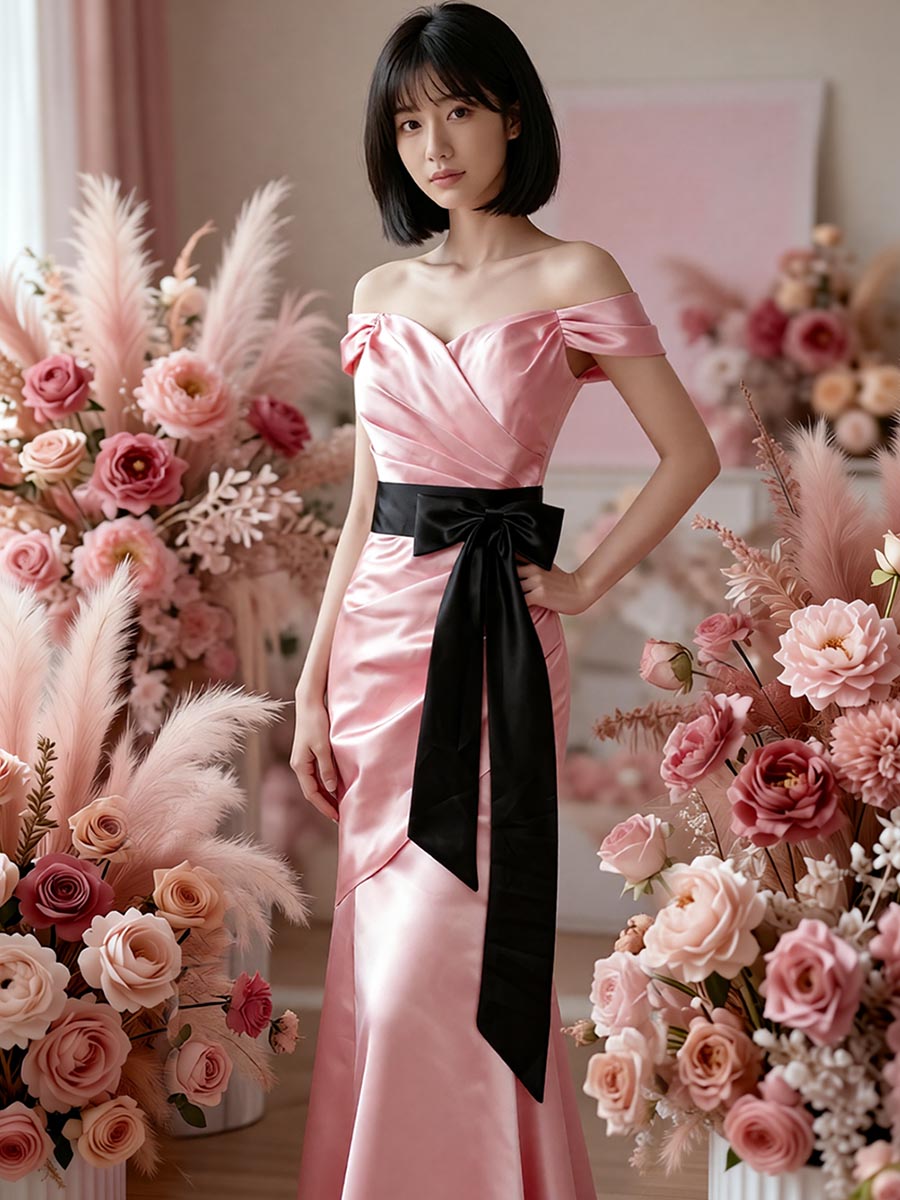 大人っぽくも可愛らしい印象を演出したオフショルダーデザインのマーメイドラインドレス。
