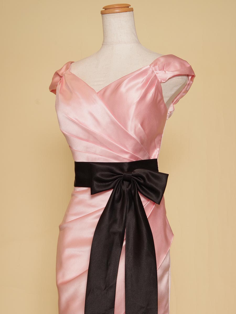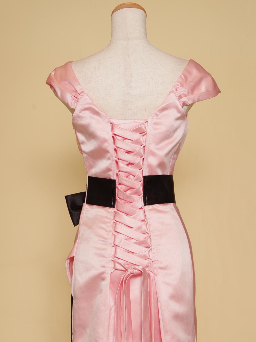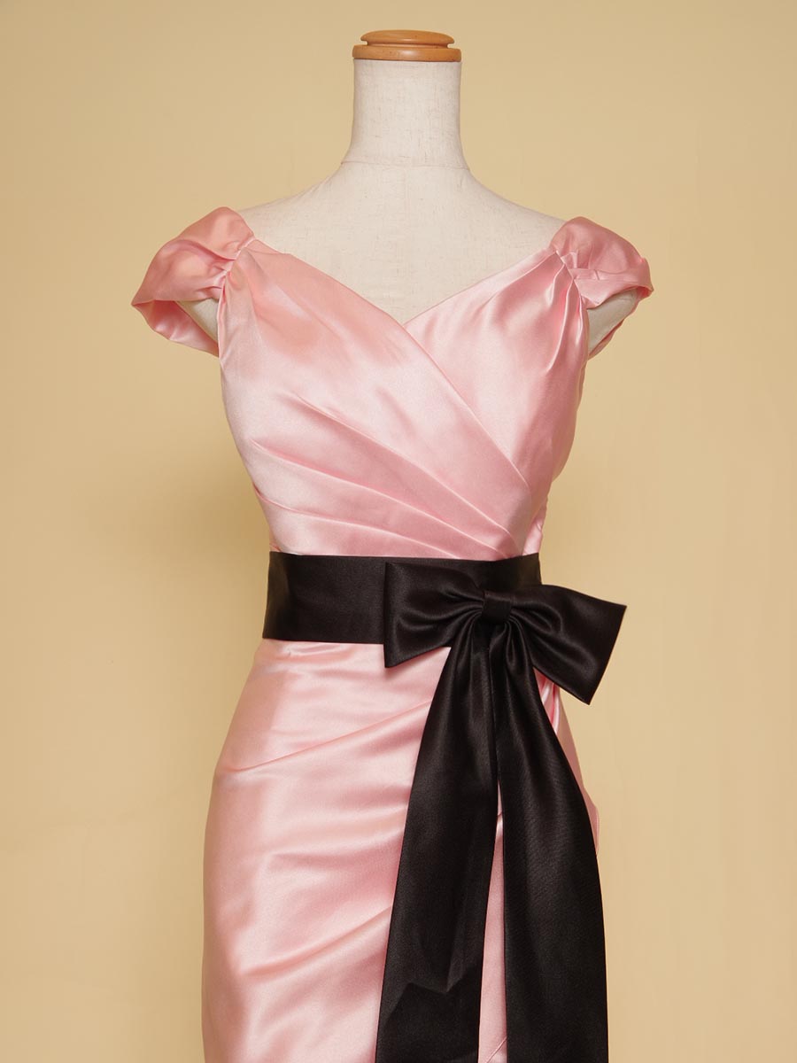パステルピンクカラーを基調に柔らかな印象を表現しながら、ウエストラインにクッキリとしたアクセントのブラックサテンのリボンデザインをレイアウトして程よい大人っぽさもプラスして、子供っぽくなり過ぎないデザインとなっております。