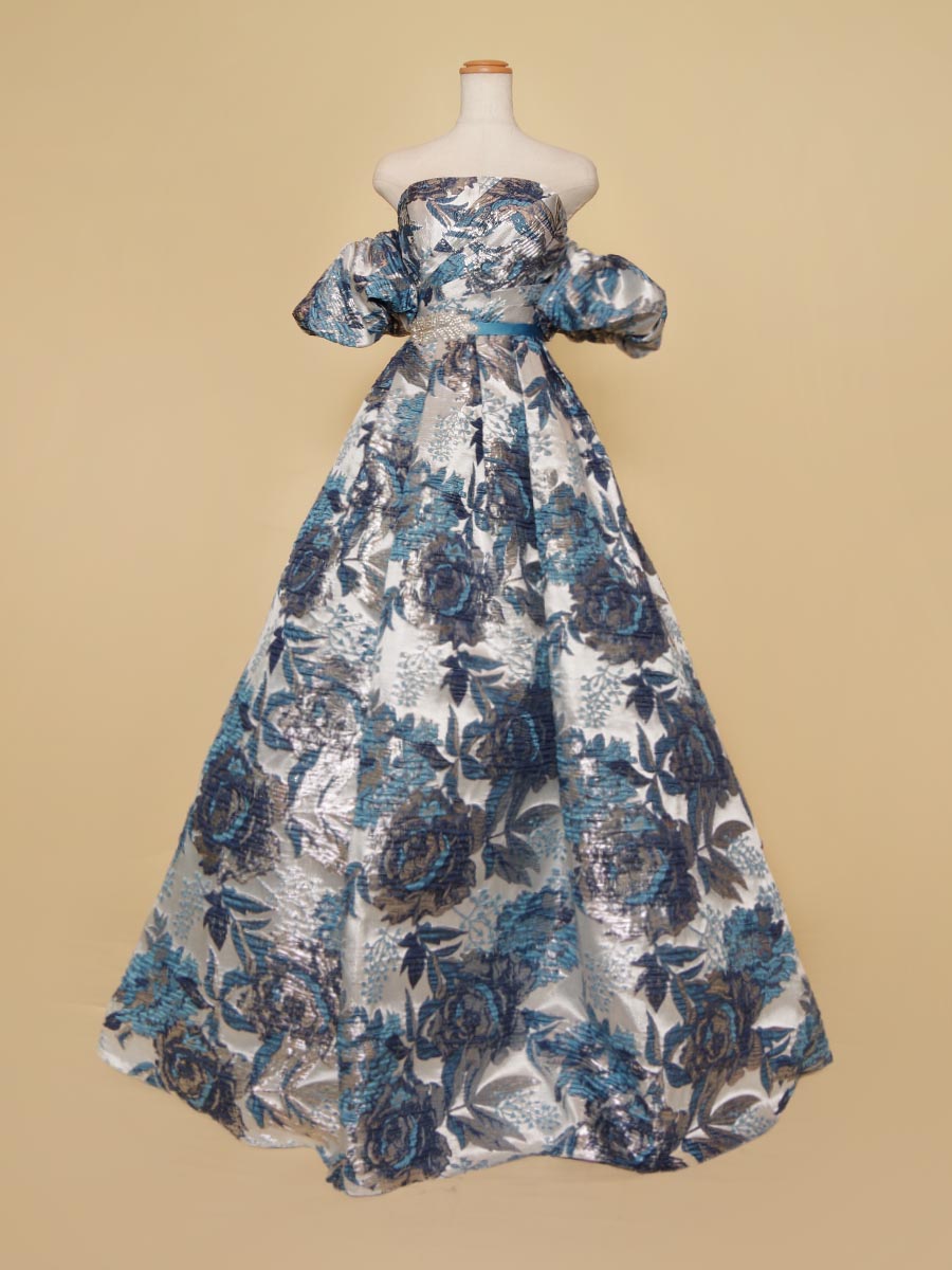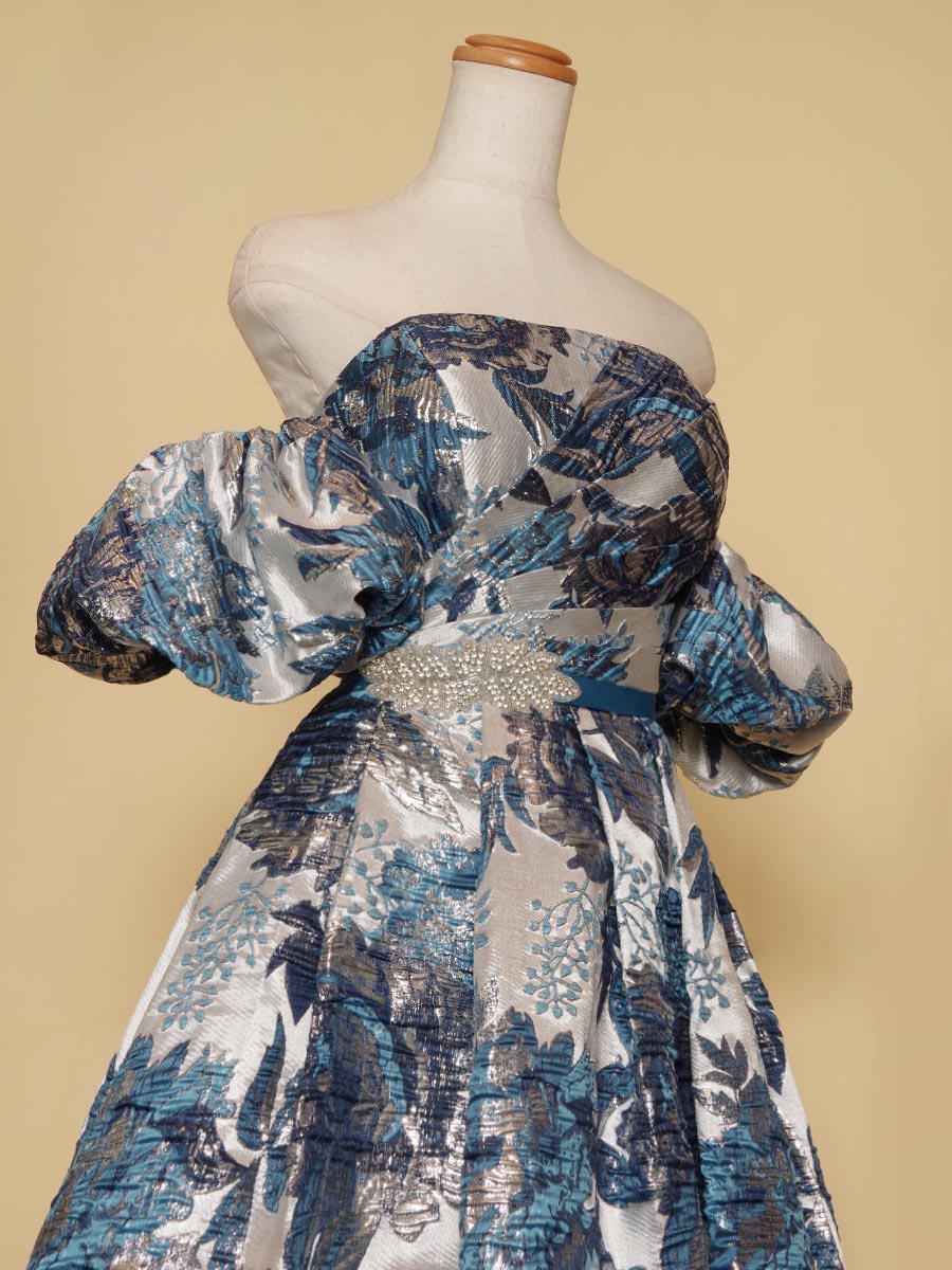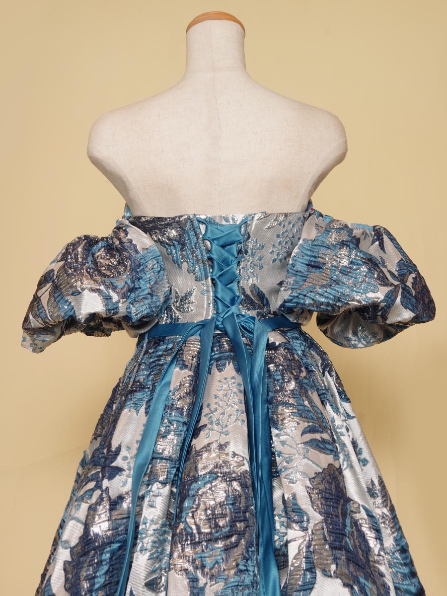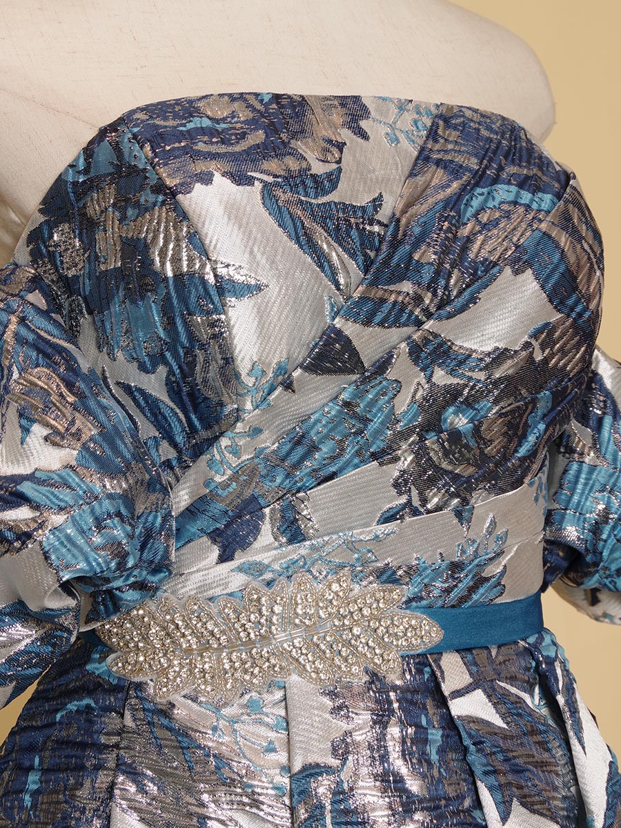 ゴージャスなブルーの光沢を放つジャガード生地をベースにデザインされた、取り外しと位置調整が可能なオフショルダーデザイン演奏会ドレス。