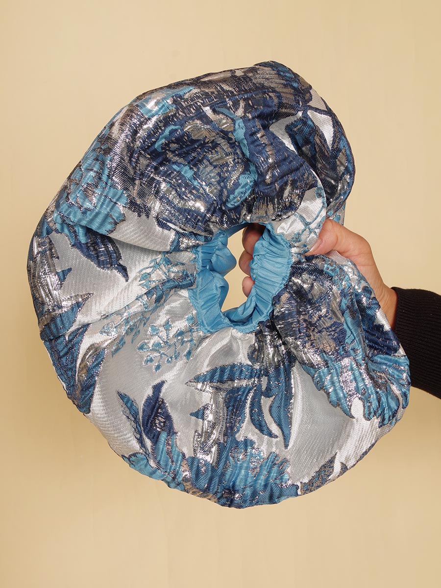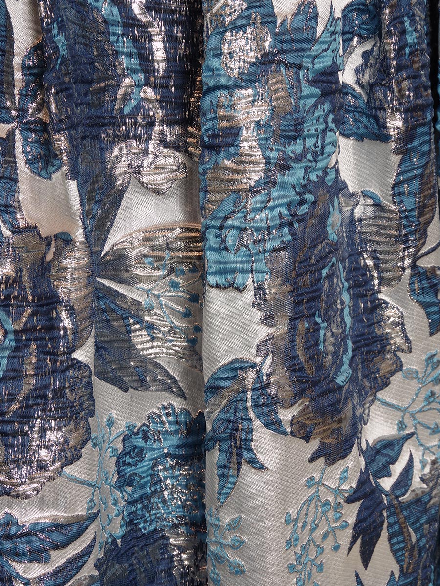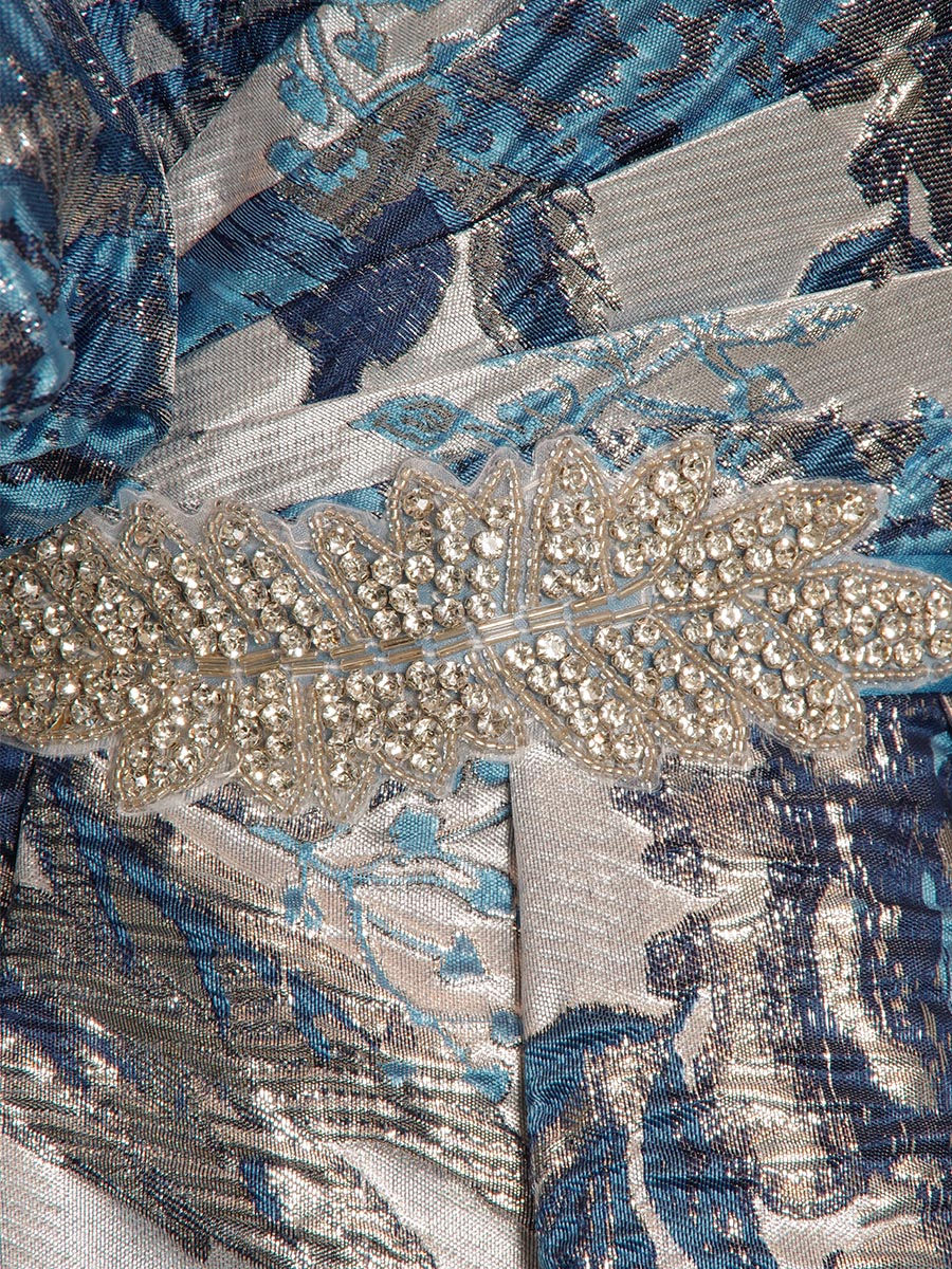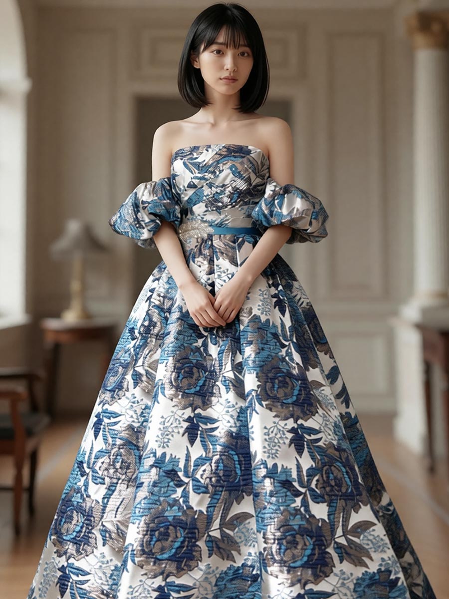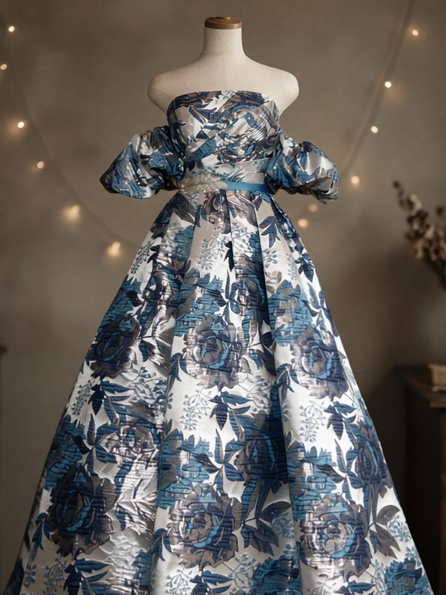 ゴージャスなブルーの光沢を放つジャガード生地をベースにデザインされた、取り外しと位置調整が可能なオフショルダーデザイン演奏会ドレス。