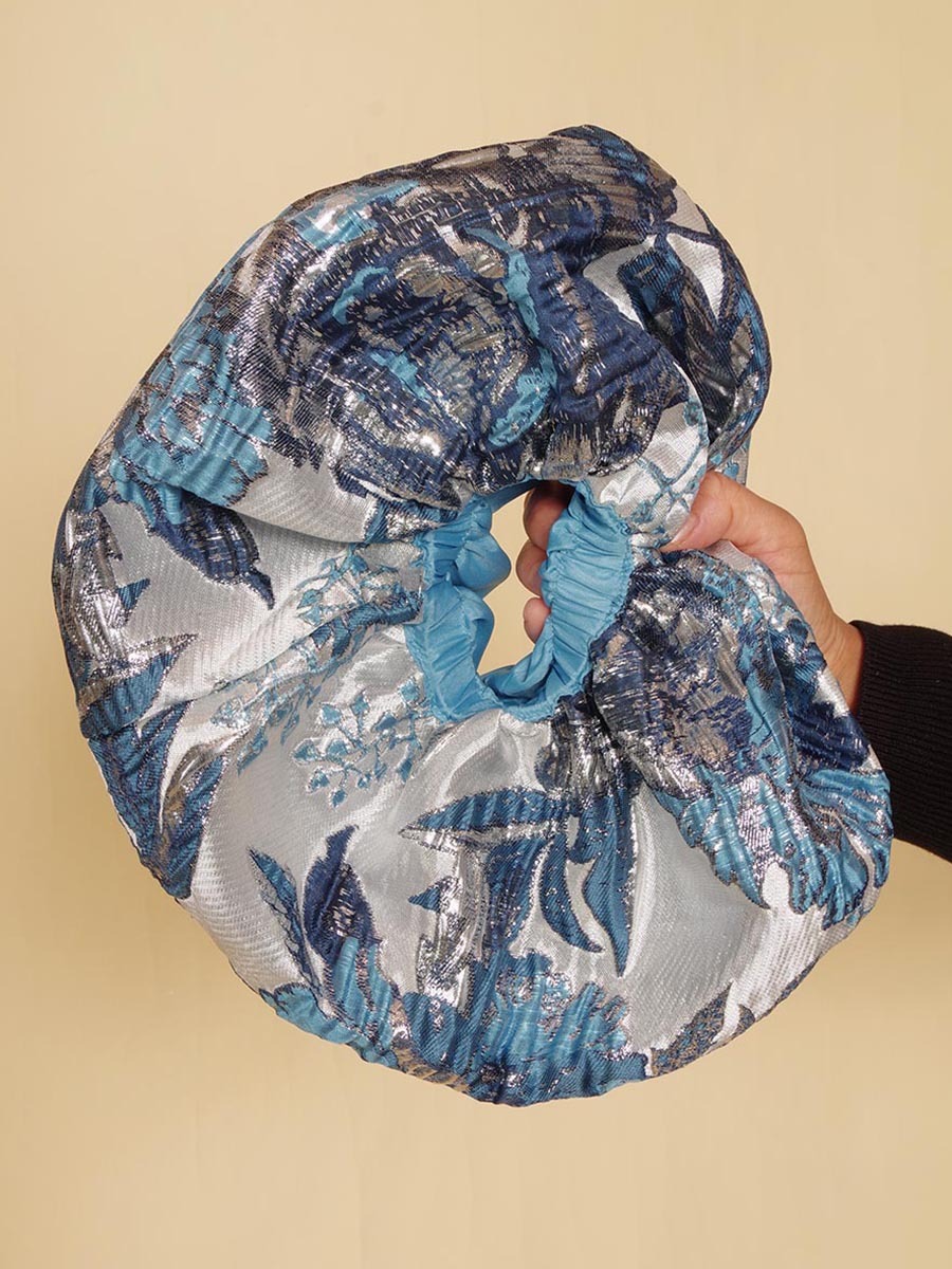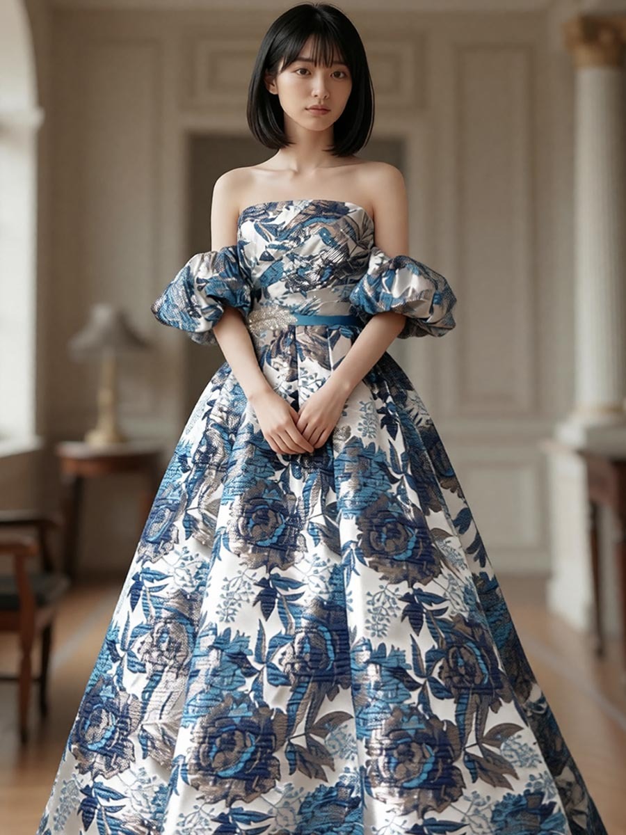 ジャガードブルーカラーをベースにデザインさせて頂いた、取り外し可能なオフショルダー設計のステージドレスの製作例のご紹介です。