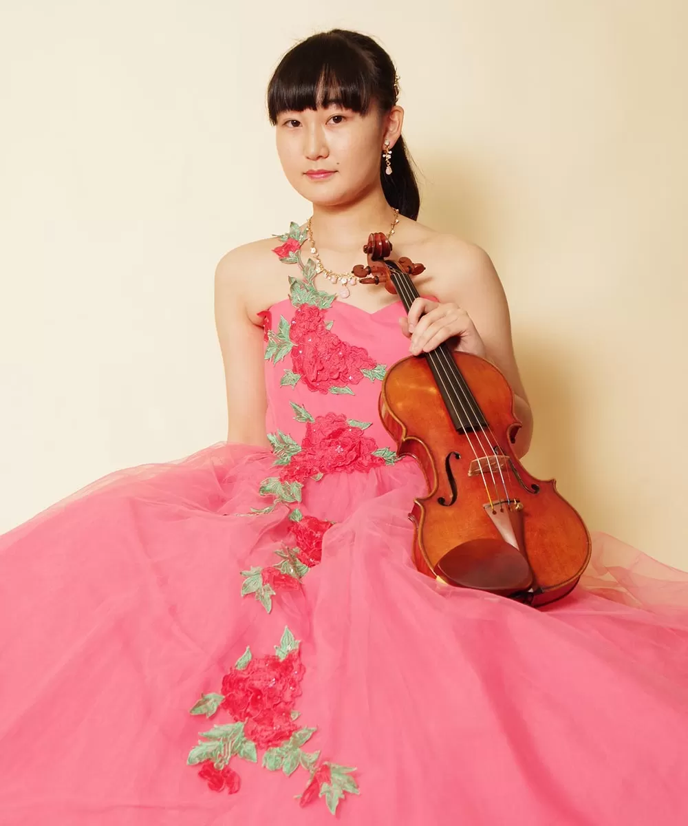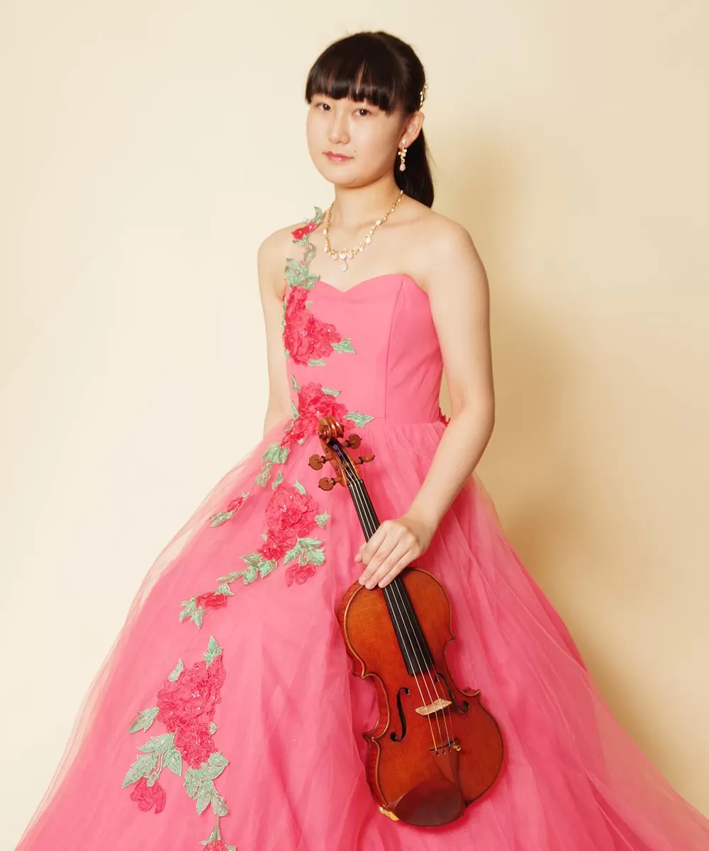 ピンクの花柄刺繍ドレスを着たバイオリニストのお客様の演奏会用写真