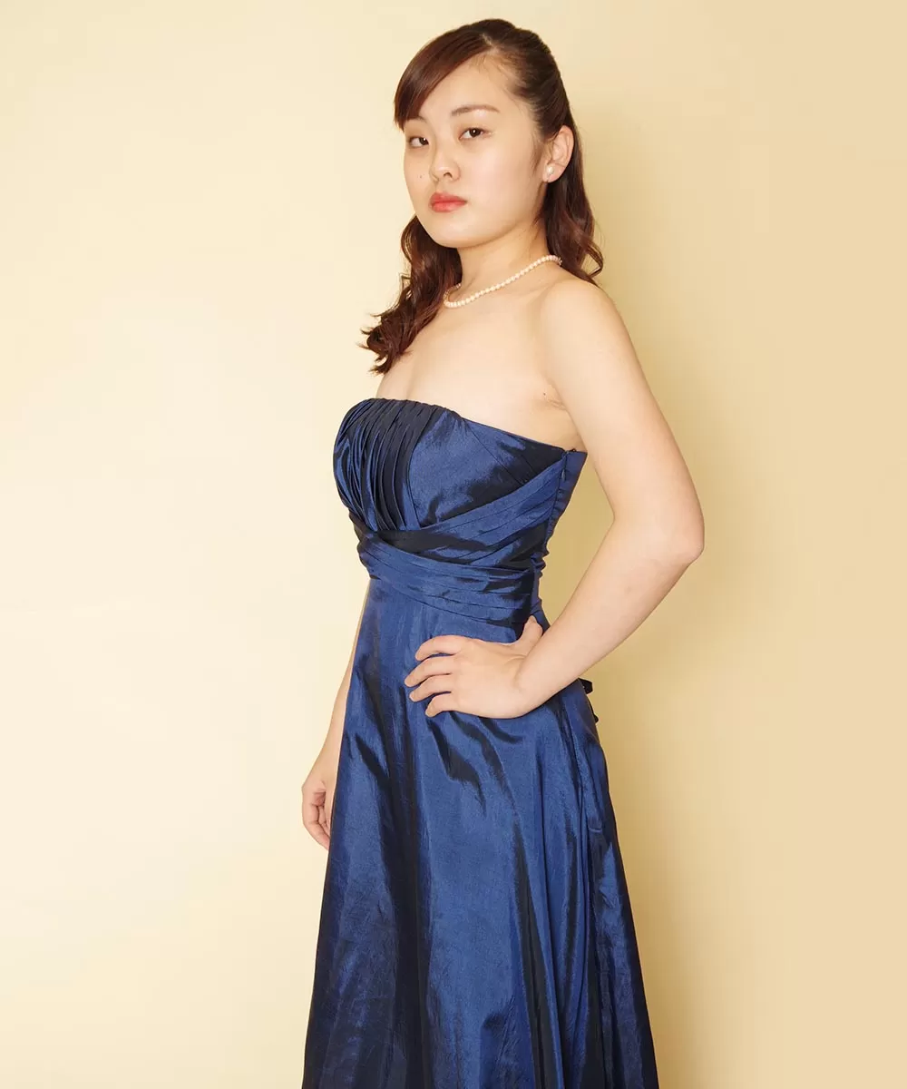 緊急事態宣言解除後初のネイビードレスを着用して撮影されたピアニストのお客様の宣材写真