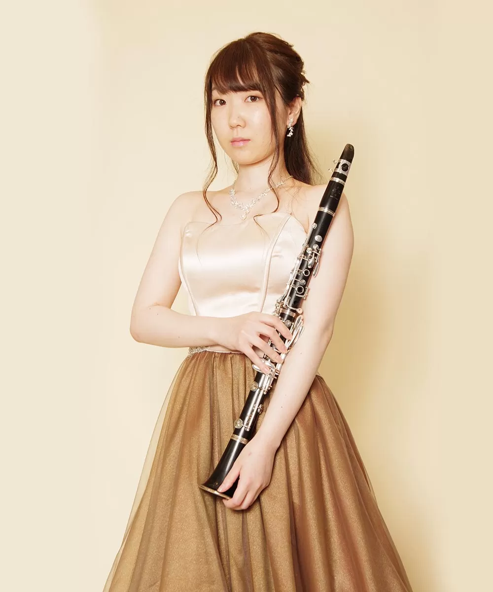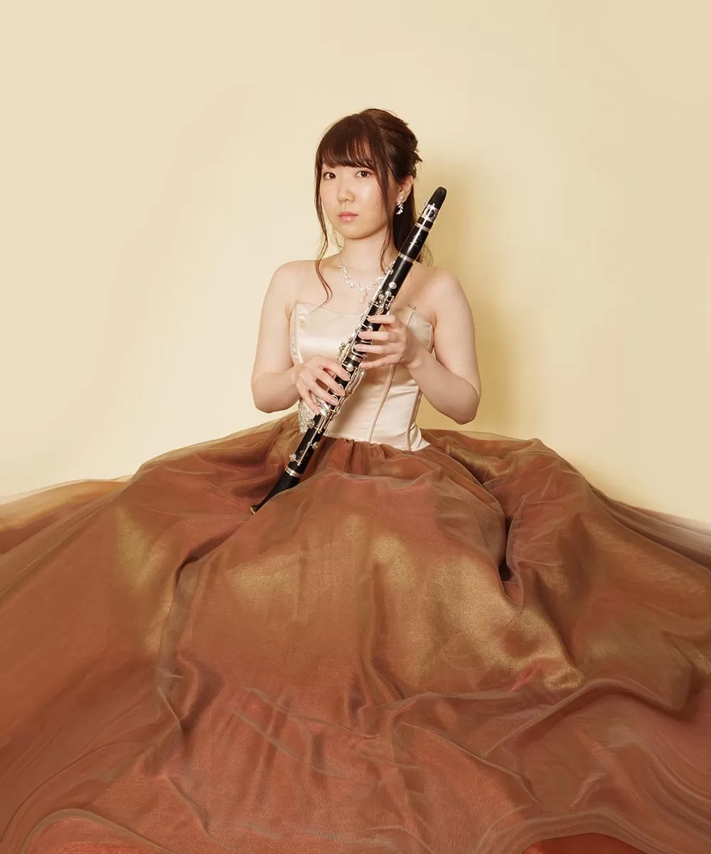 コルセットデザインのブラウンカラーのステージドレスを着用されたクラリネット奏者様の演奏会用写真