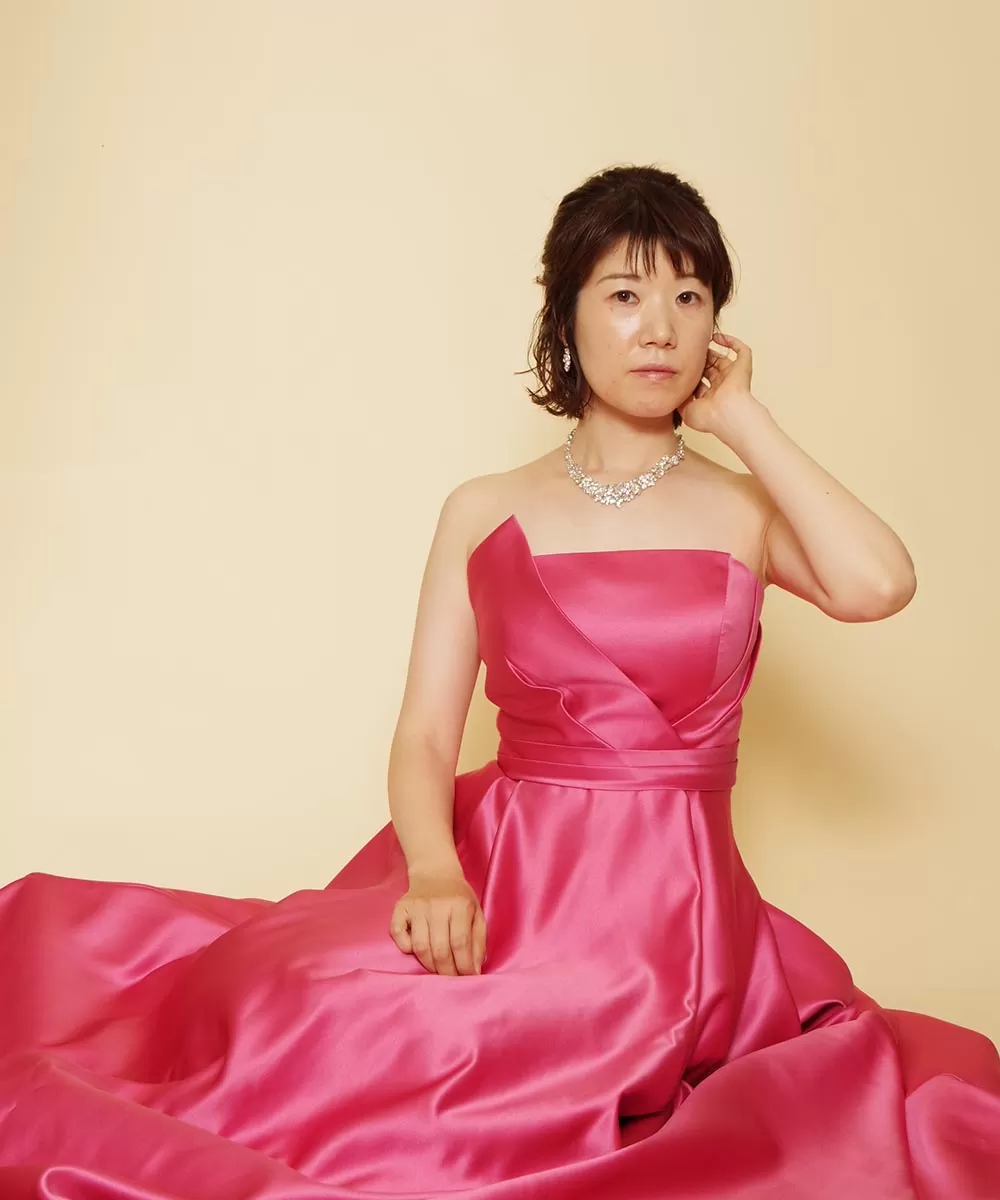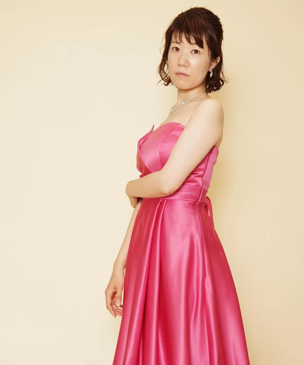 演奏会のオーディションへの提出用のお写真用に撮影をされたお客様のプロフィール写真です。着用されているピンクのドレスはドレスルームアミで販売中の胸元エッジデザインが特徴的なドレスです。スレンダーな体型のお客様でしたので、撮影の際に着用されていた際にもとても良くお似合いになっていました。今回のお客様の様に、コンクールや演奏会のオーディション用に撮影を行う際に、「手持ちのドレス以外で雰囲気を変えたドレスアップをして撮影したい」という場合にも、豊富なレンタルドレスのラインナップの中からドレスをチョイスして撮影が行える当スタジオの撮影サービスを活用して、是非音楽活動で実りのある成果を出してみてください!