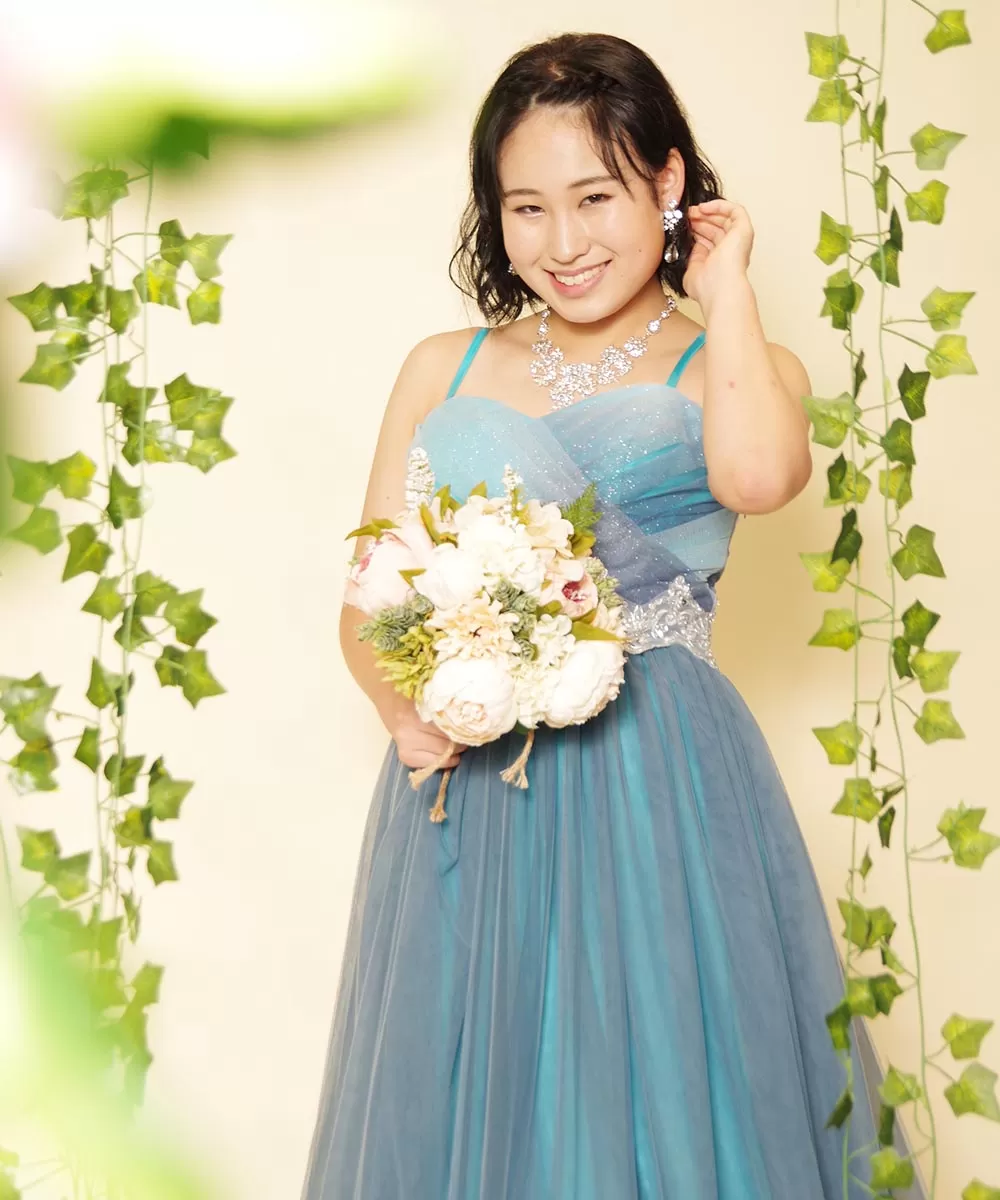 オーディションに提出する用に撮影を行ったお客様の宣材写真です。今回の撮影では、ドレスルームアミフォトスタジオがご提供する「お花畑撮影サービス」をご利用いただきました。撮影の際にブーケのお貸出しもさせて頂き、写真全体に草花が散りばめられたフェミニンな雰囲気の写真に仕上がったかと思います。今回着用されているドレスは胸元にグリッターが多く付いているデザインなので、写真撮影の際にも煌びやかさが遺憾なく発揮されているため、草花の隙間から美しい輝きが表現されています。