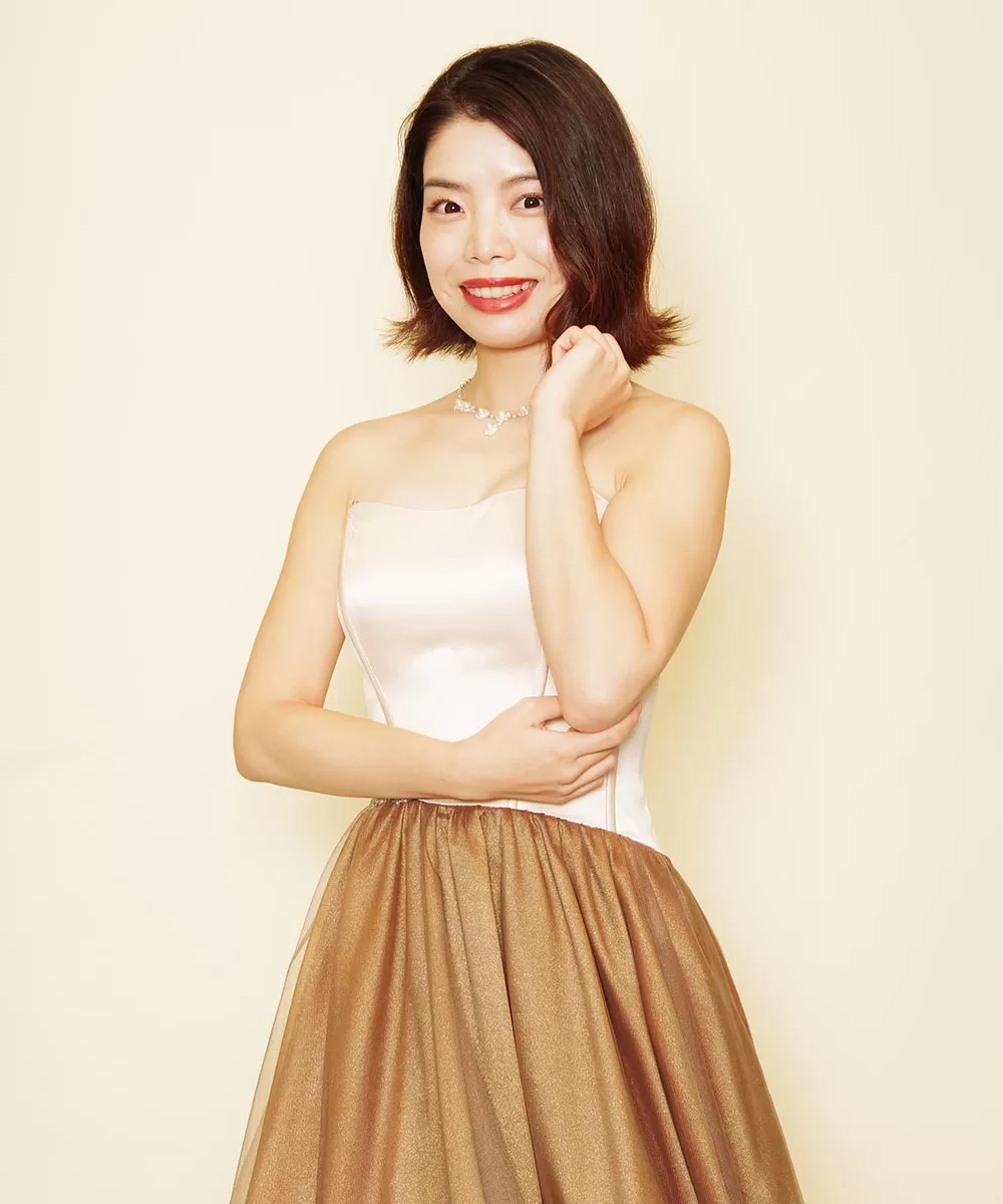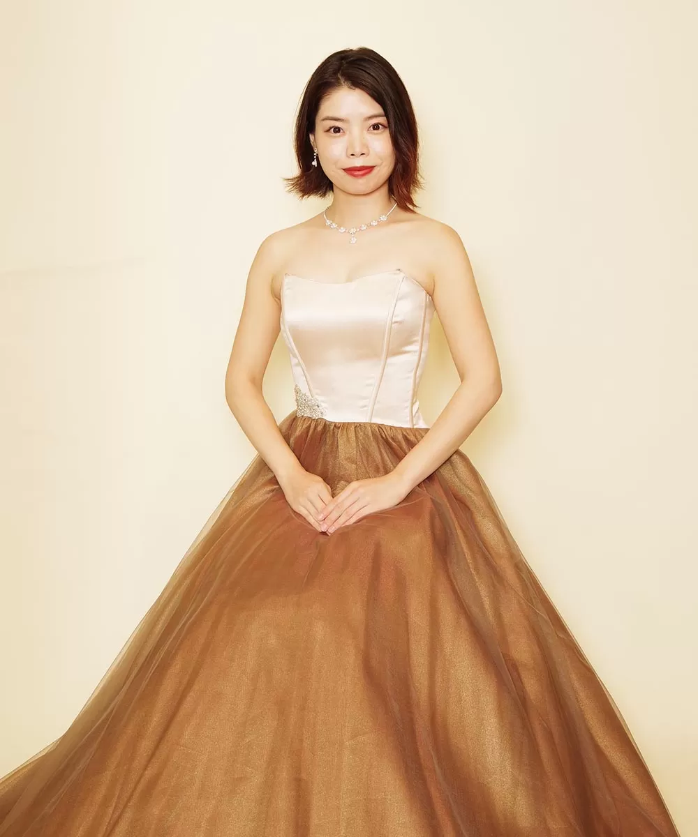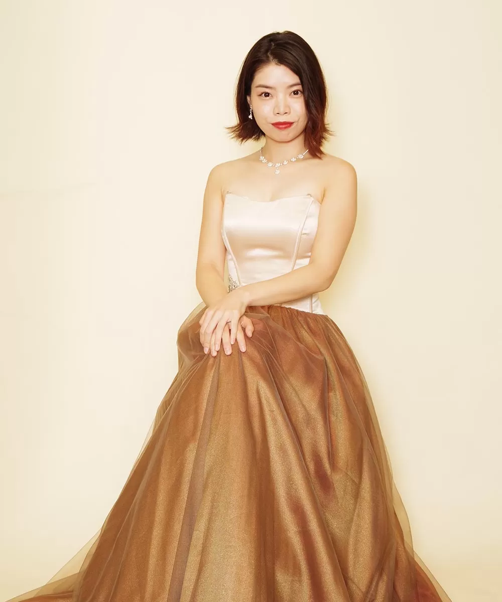 ドレスルームアミでもお洒落なデザインとカラーリングから人気のブラウンチュールのドレスをお貸出しさせて頂き撮影を行ったお客様のコンサート用の宣材写真です。暗めのブラウンのスカートとは対極的に、胸元はオフホワイトカラーで明るく仕上がったドレスですので、今回撮影したお写真からも分かるように、お顔周りが明るく見える効果のあるドレスでもあります。