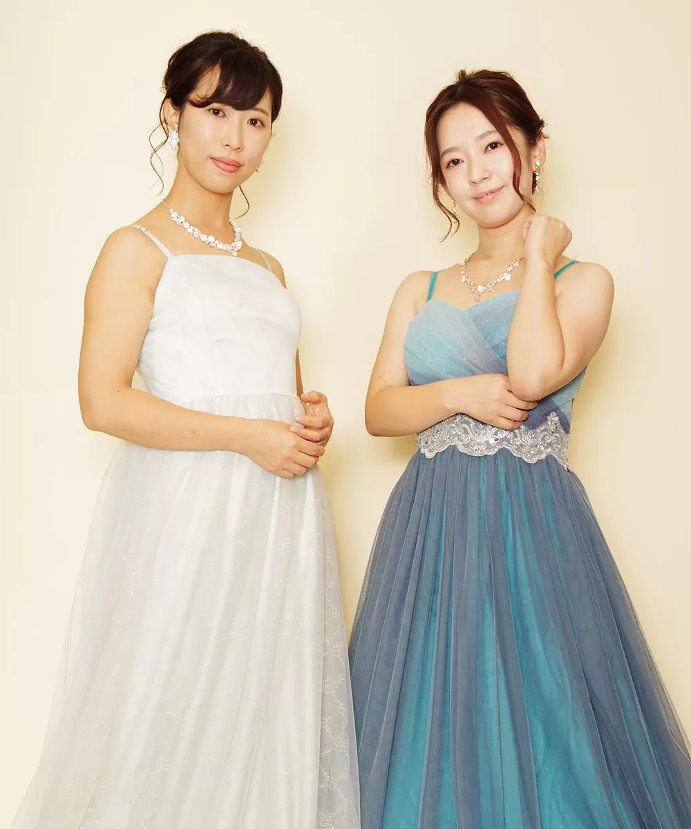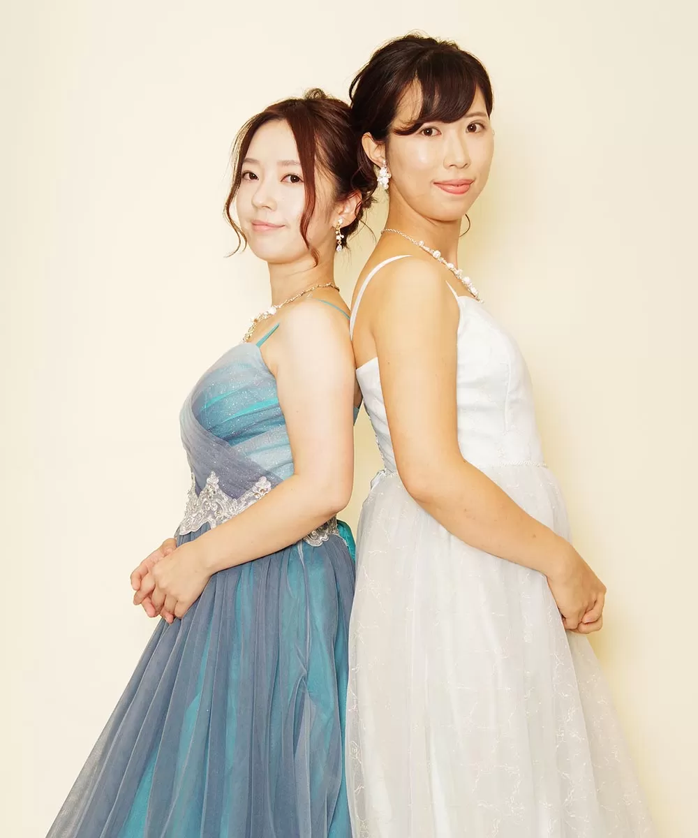 爽やかなブルー系のドレスを着用された仲良し二人組の演奏会用写真