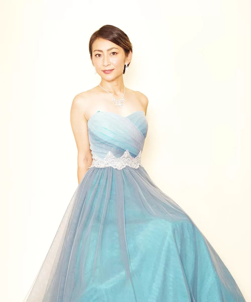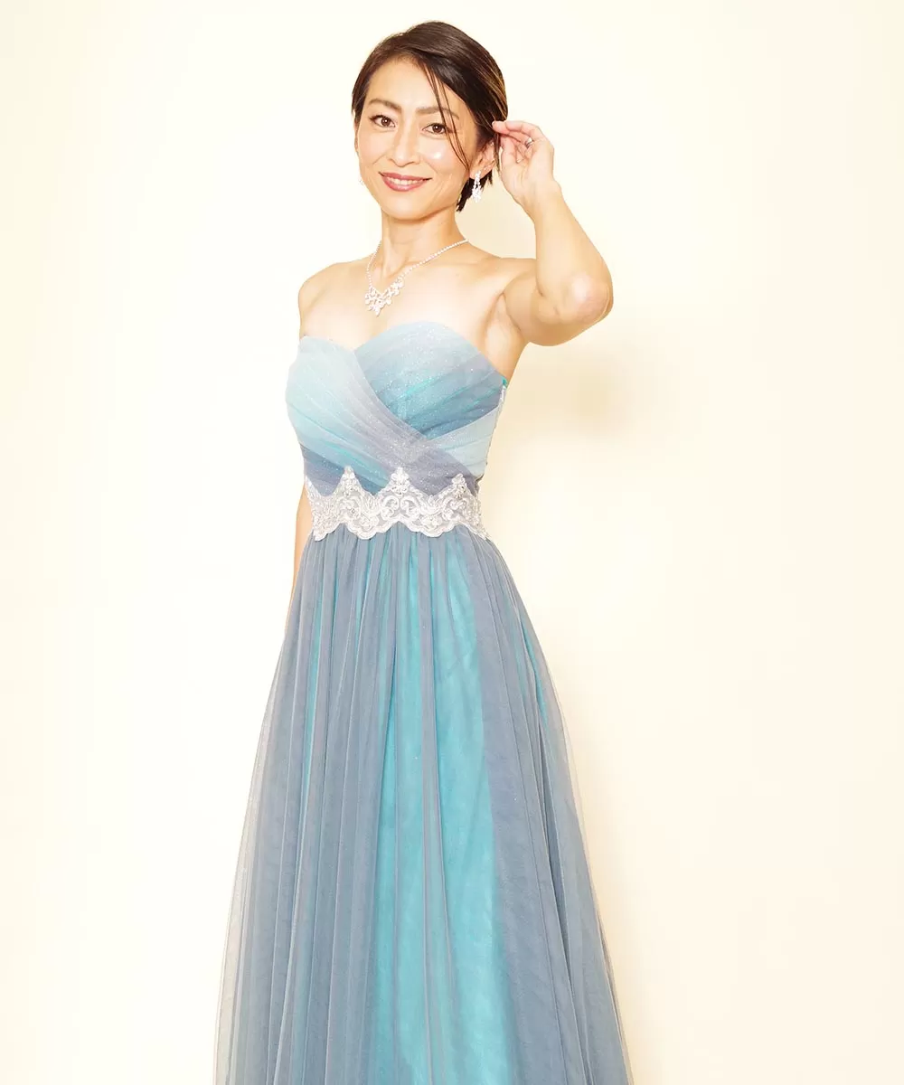 着用頂いているドレスはドレスルームアミでも永く人気を博しているグリッターの輝きが美しいブルードレスで、スラっとしたお客様の体型にとても良く似合っていました。