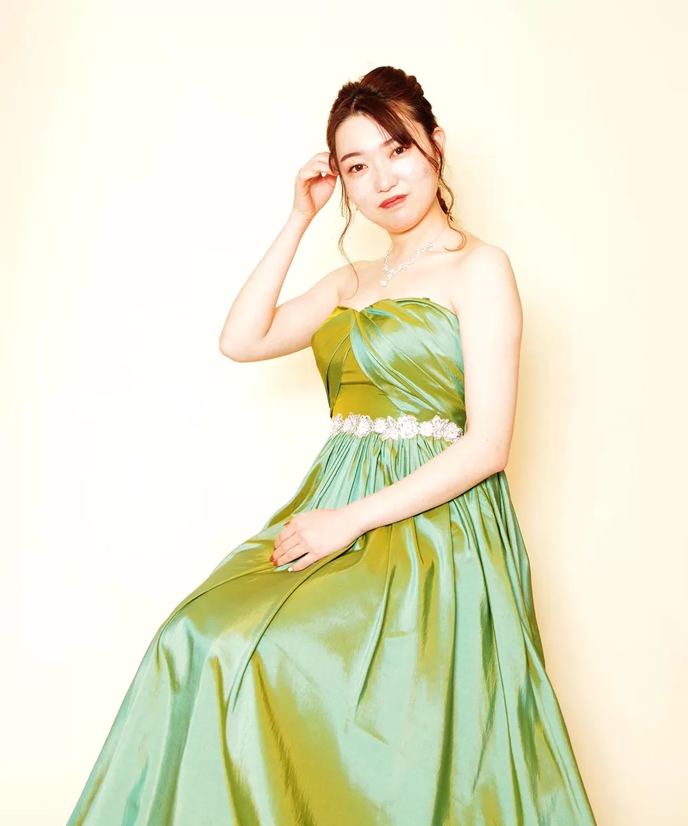光沢感の美しいエメラルドグリーンドレスを着用してのプロフィール写真