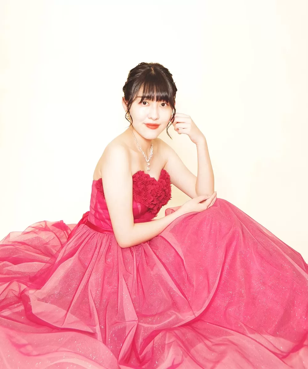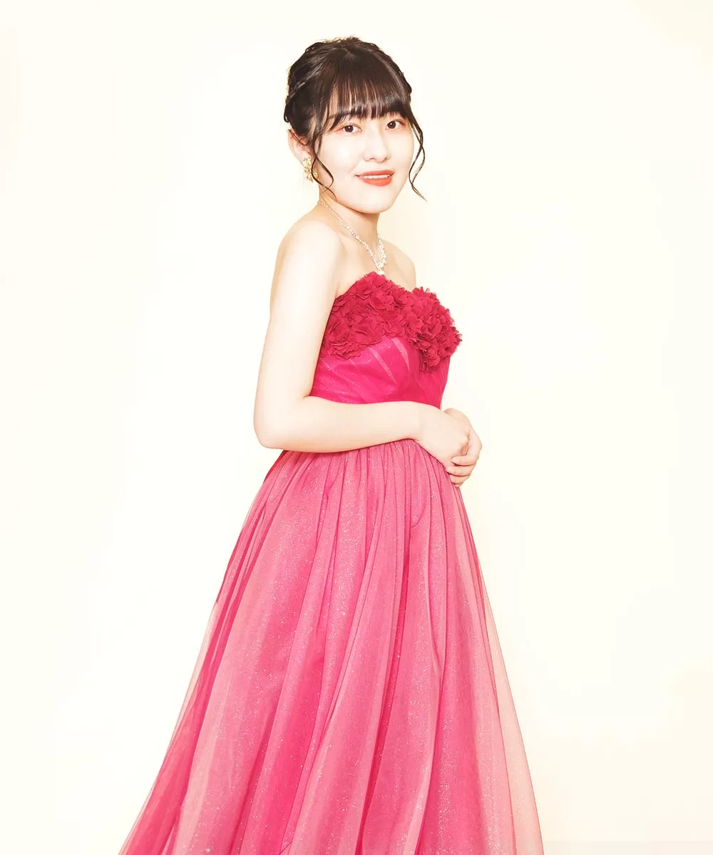 フラワー立体レッドカラードレスを着用しての演奏家のお客様の宣材写真