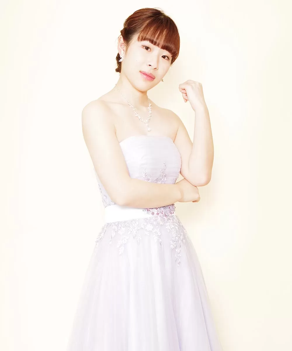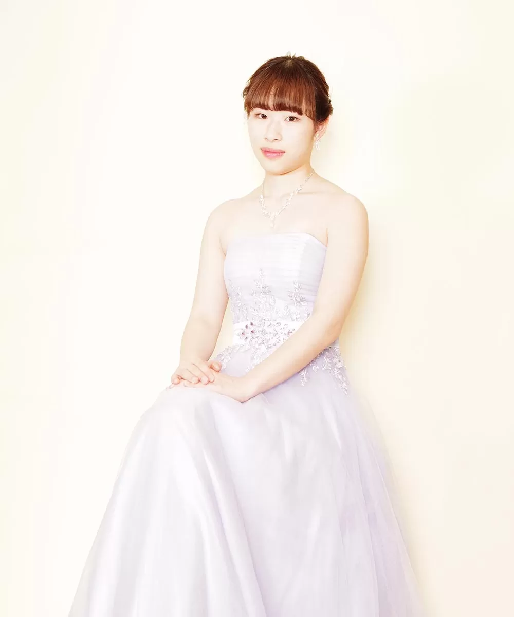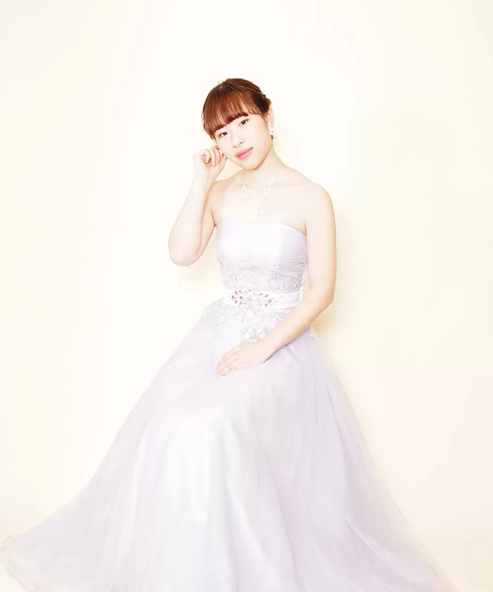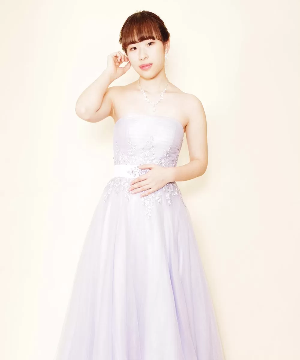 パステルパープルのお持ち込みドレスを着用された演奏家のお客様の宣材写真