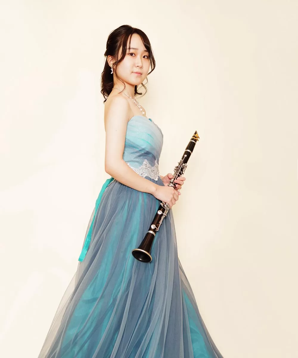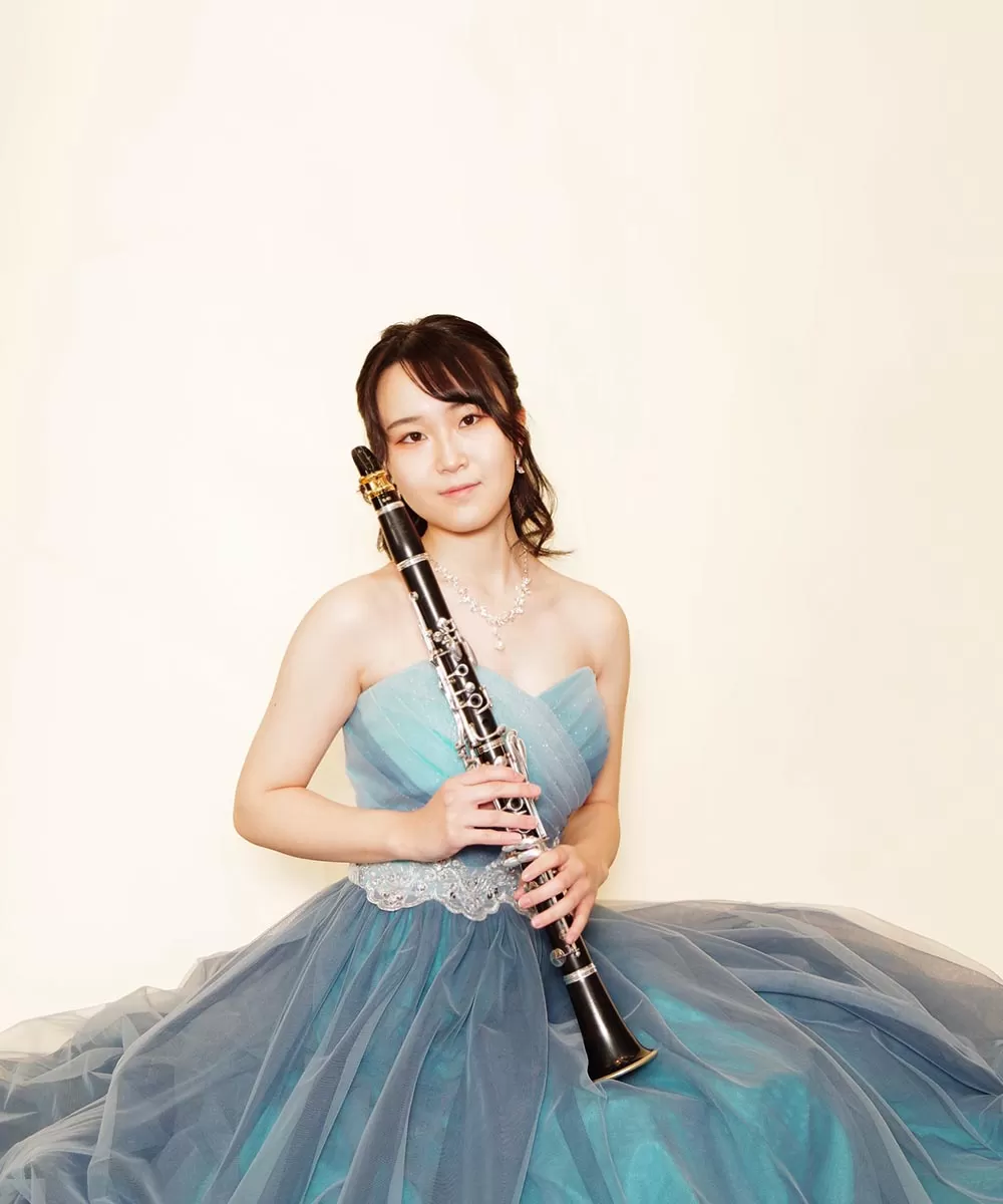 グリッターの輝きが美しいブルードレスを身にまとったクラリネット奏者のお客様の宣材写真