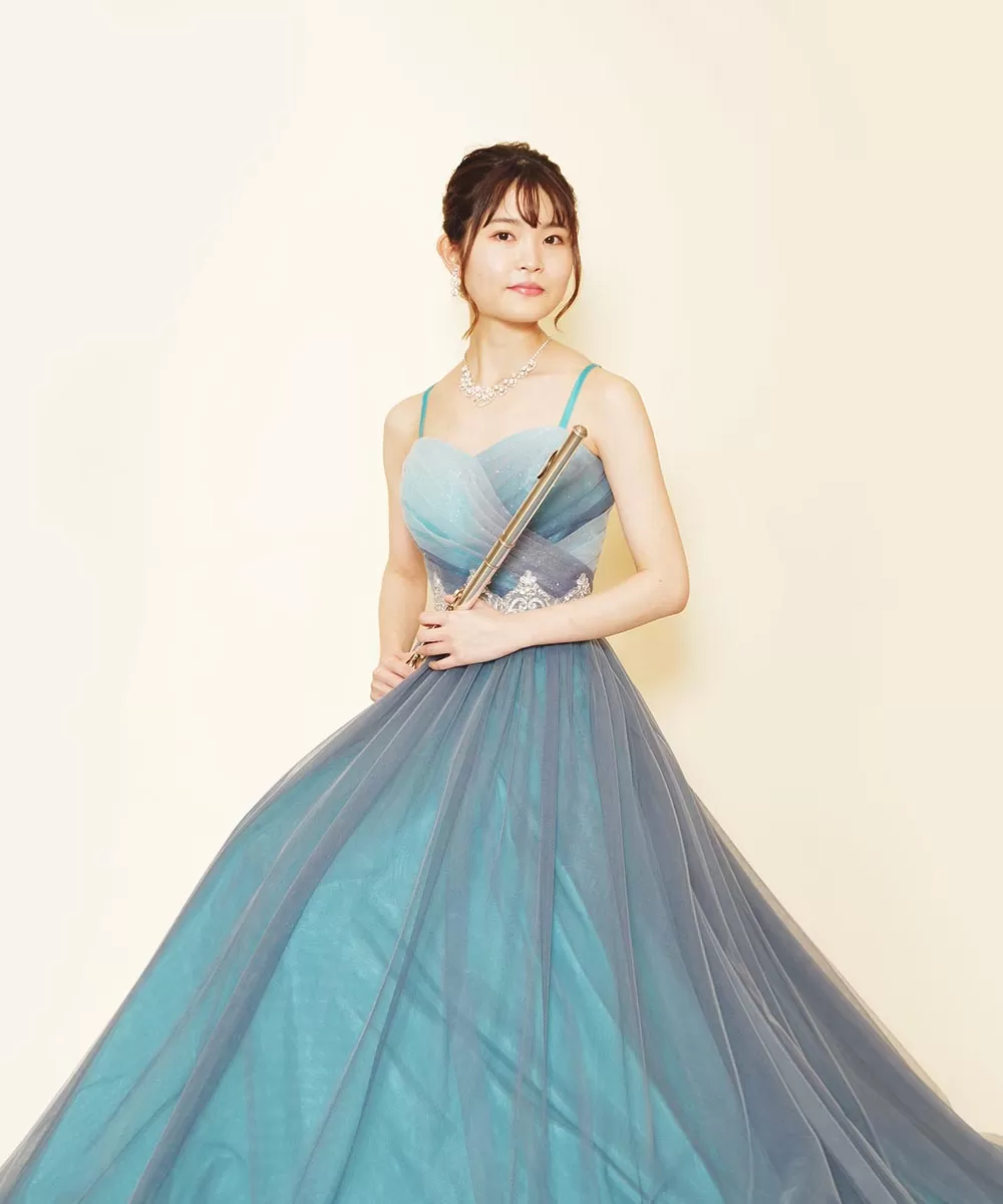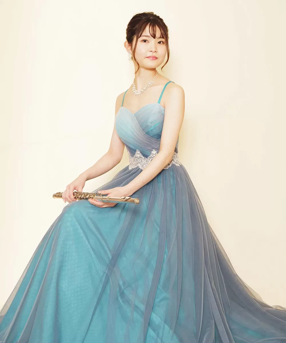 ブルードレスを着用されたフルーティストのお客様の宣材写真