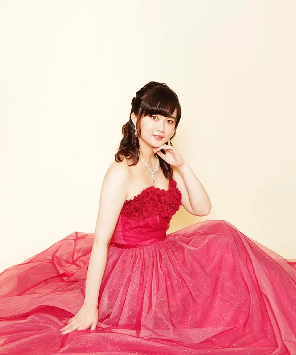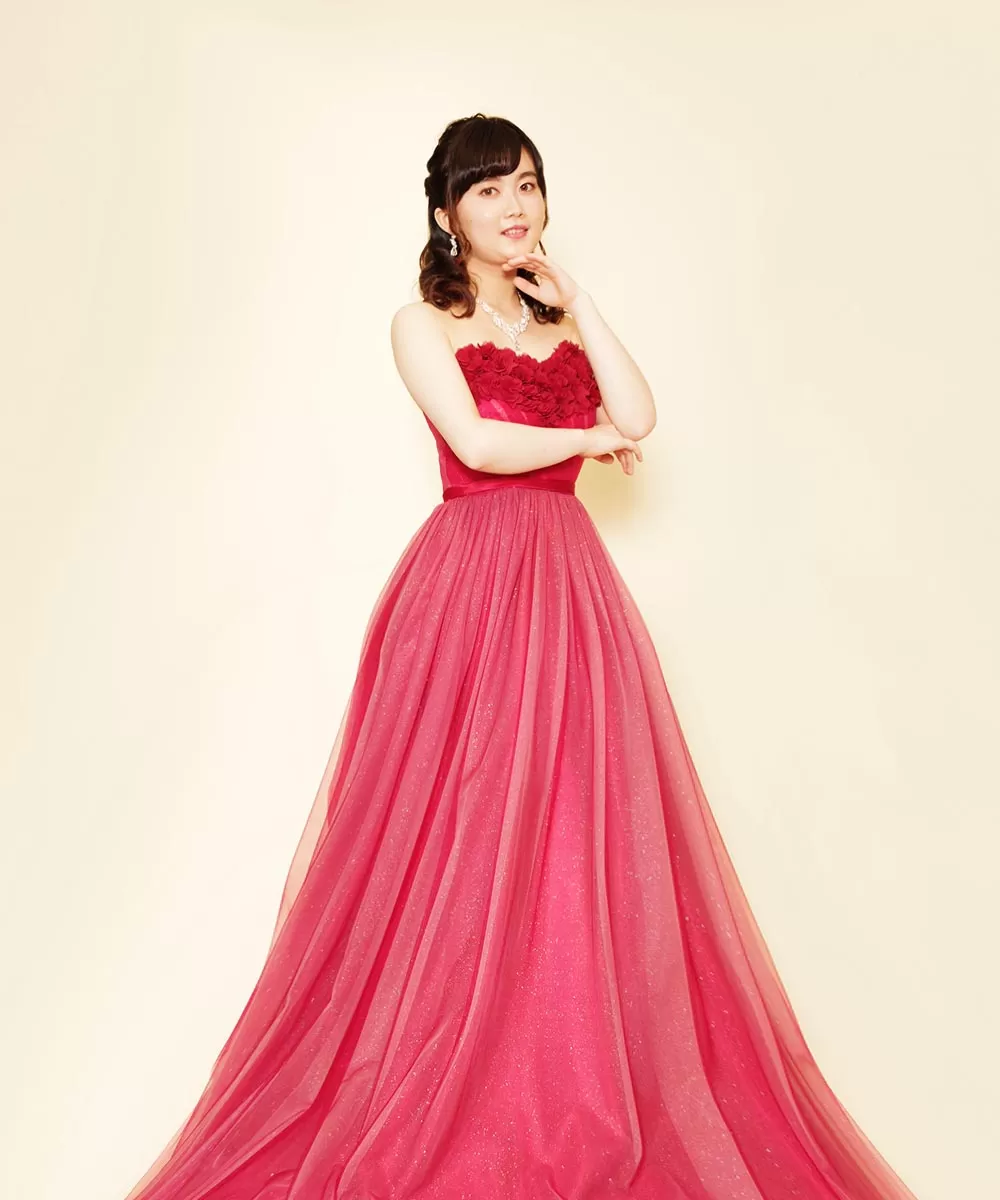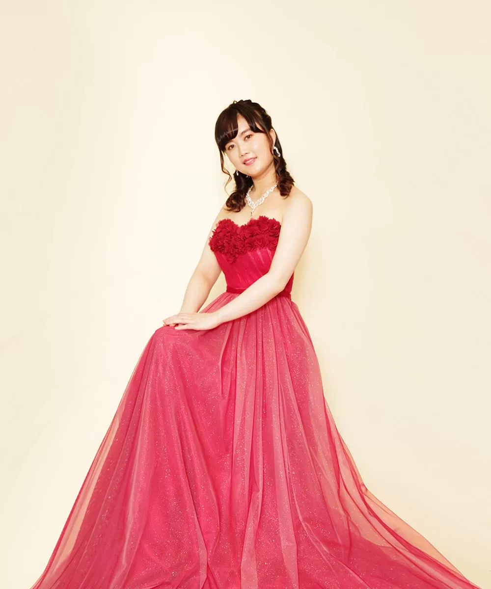 ドレスルームアミフォトスタジオでお貸出しを行っているレッドカラーの胸元立体フラワードレスをレンタル頂き撮影を行った音楽家のお客様のプロフィール写真です。