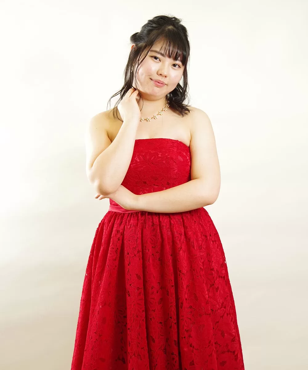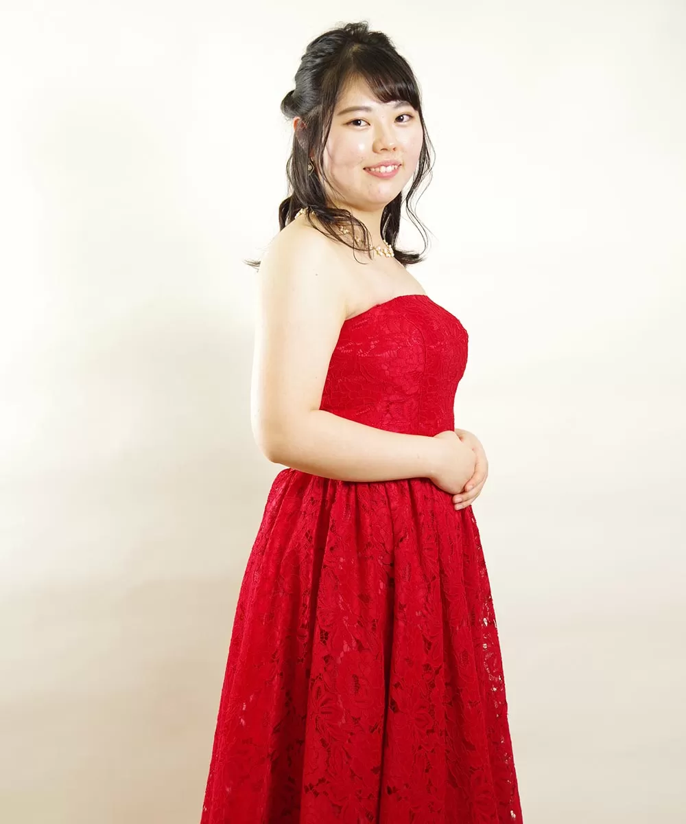 ドレスルームアミオリジナルデザインの総レースのレッドカラードレスを身に纏ってのプロフィール写真の撮影でした。今回ご来店頂いたコチラのお客様はお友達3名でご来店されて撮影を行なわれました。レッドカラーのドレスはお写真全体が明るく見える上に、お顔の色合いも綺麗に見えやすいカラーです。明るい印象の演奏を行なう際のコンサートのプロフィール写真には最適です。