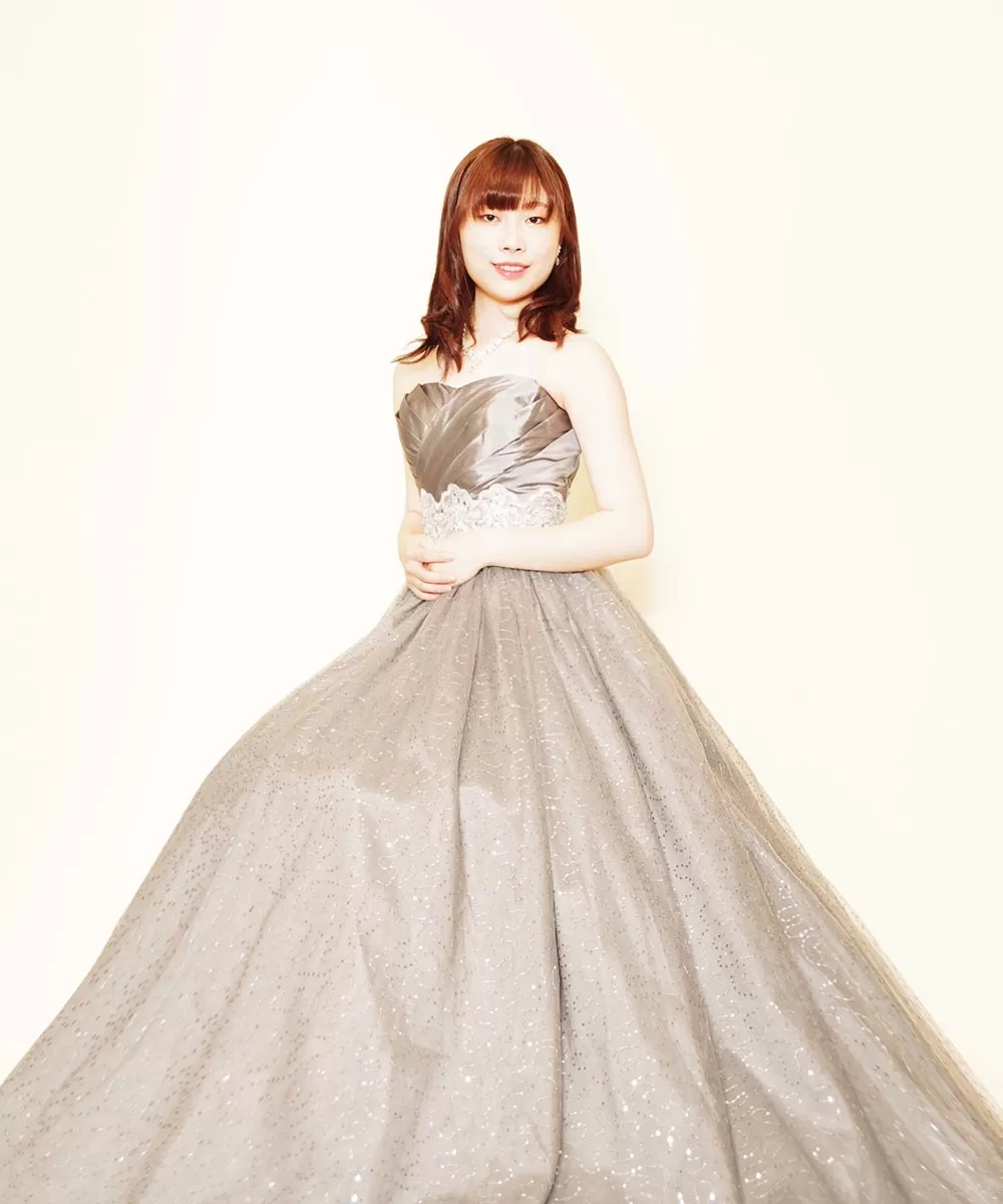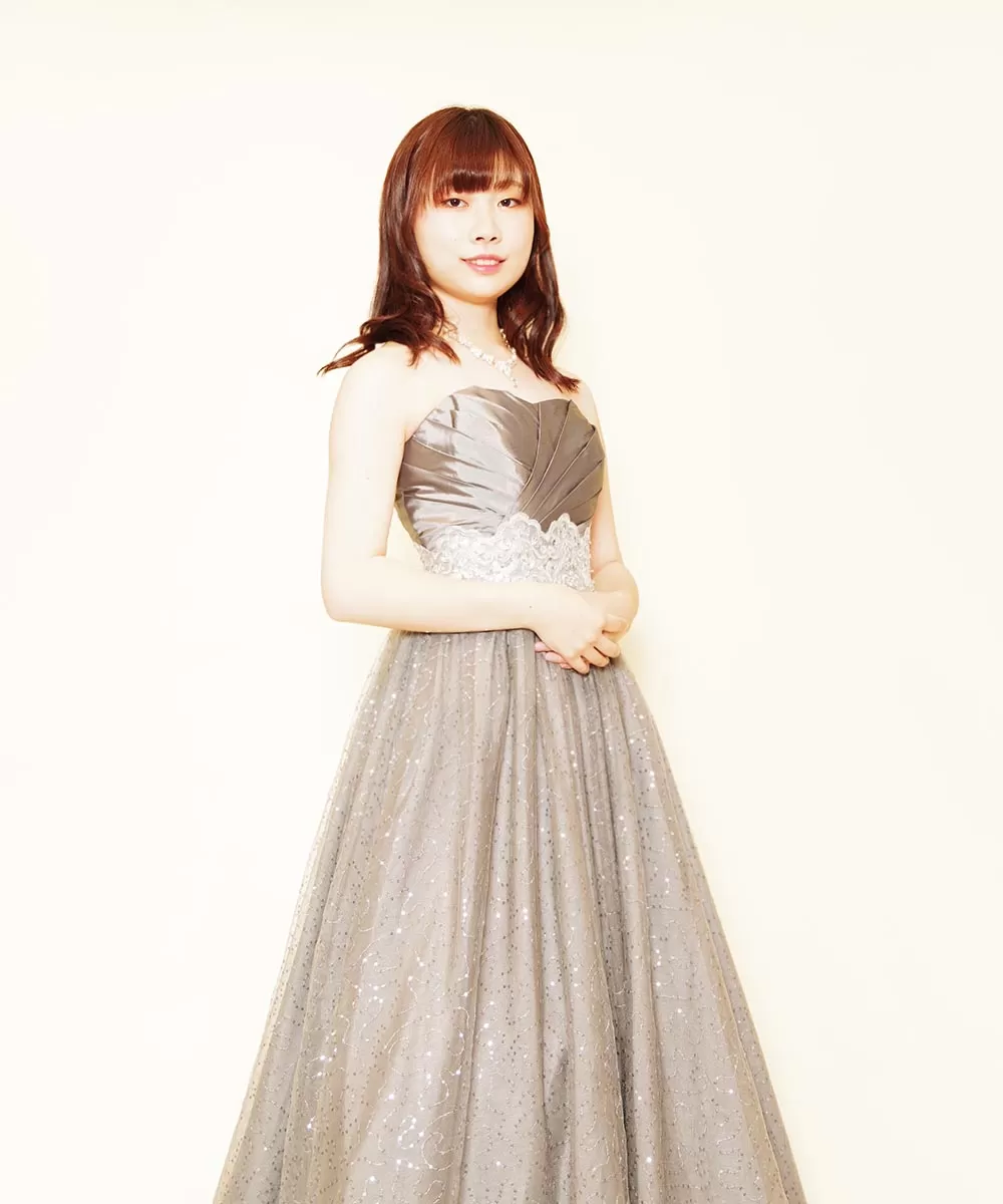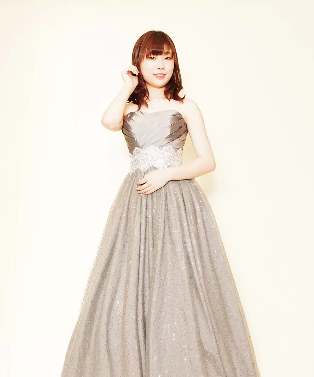 ドレスルームアミで長きに渡って音楽家の方々に選ばれてきたシルバーカラードレスのmk063siをご購入頂いたから撮影を行わせて頂いた演奏家のお客様の宣材写真です。