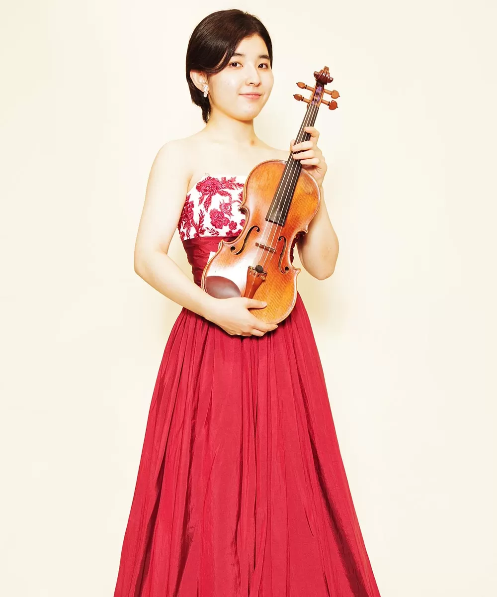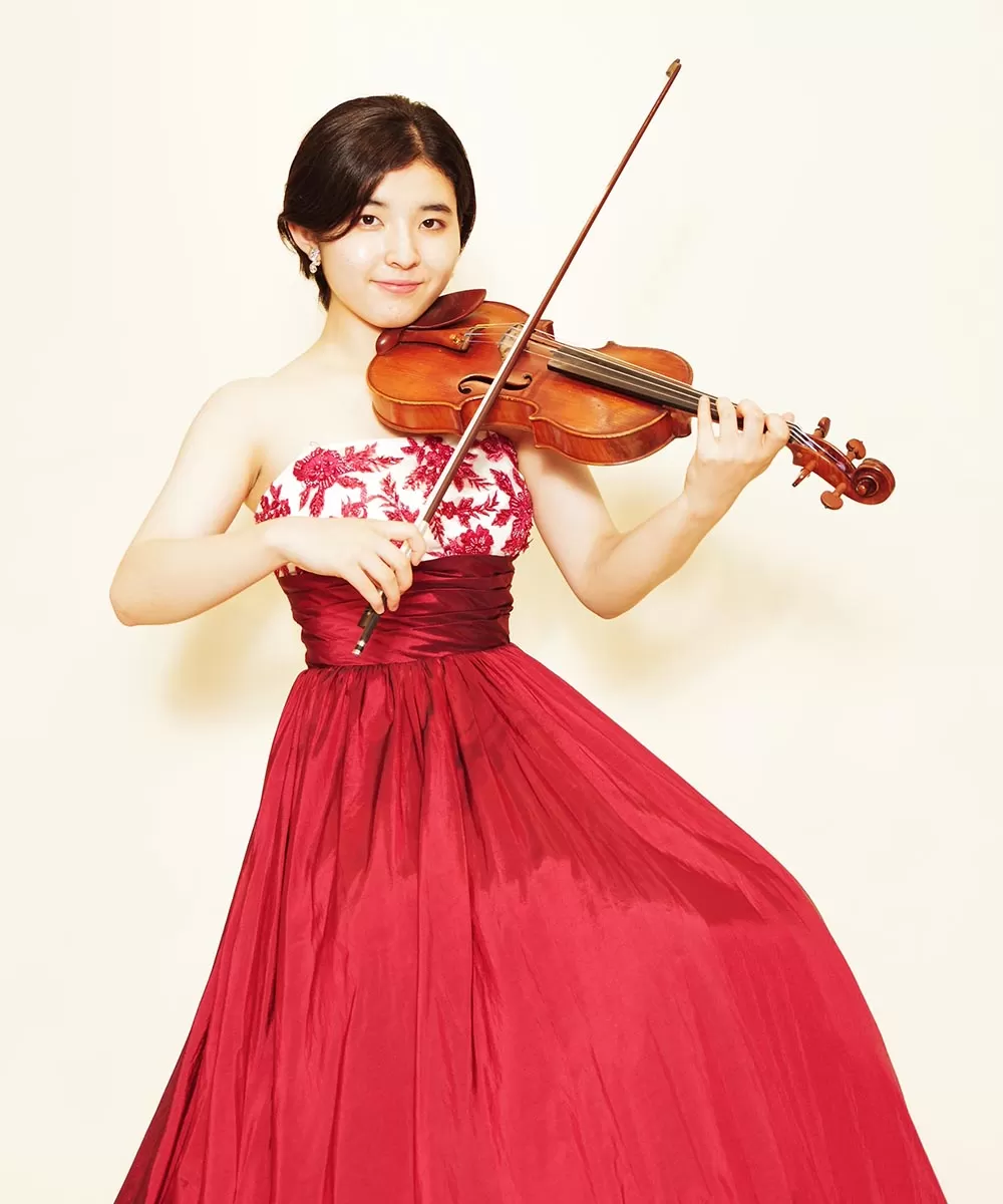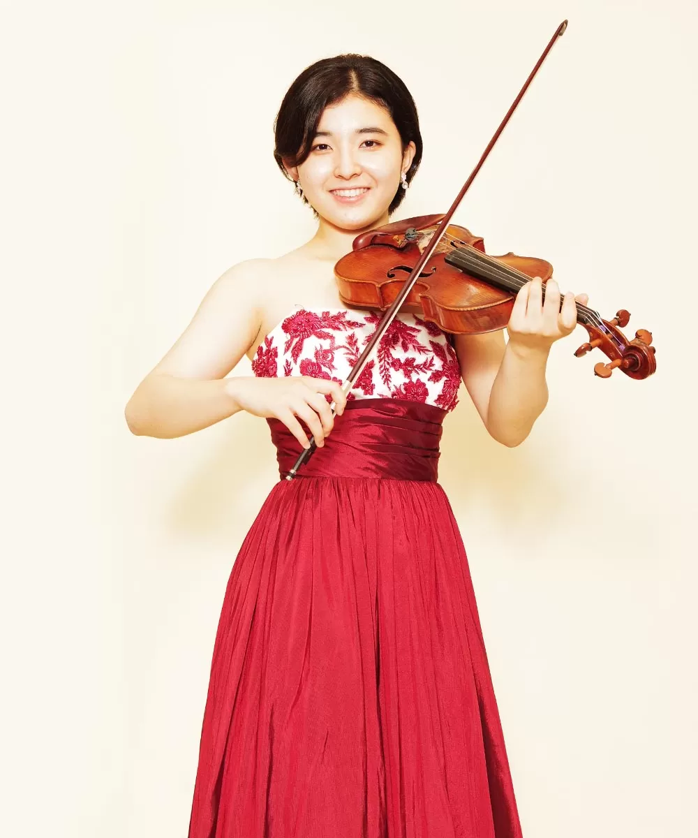ドレスルームアミでレッドのカラードレスを以前にご購入頂いてから、そのドレスをご持参頂き撮影を行ったバイオリニストのお客様の宣材写真。