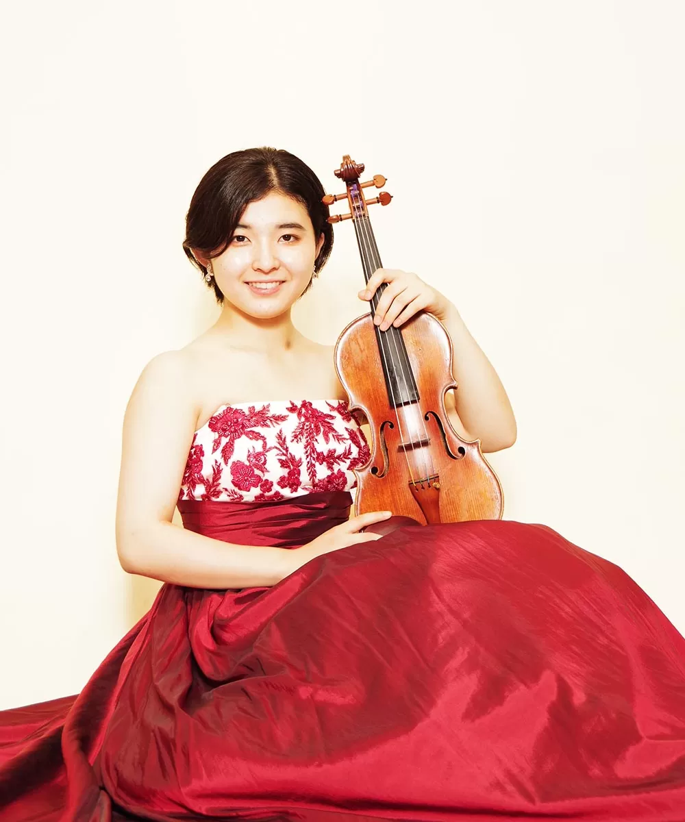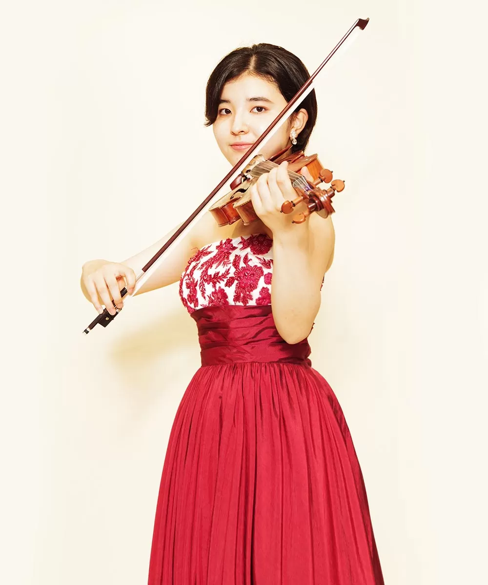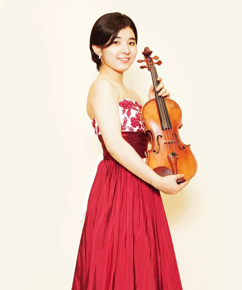 ドレスルームアミでレッドのカラードレスを以前にご購入頂いてから、そのドレスをご持参頂き撮影を行ったバイオリニストのお客様の宣材写真。