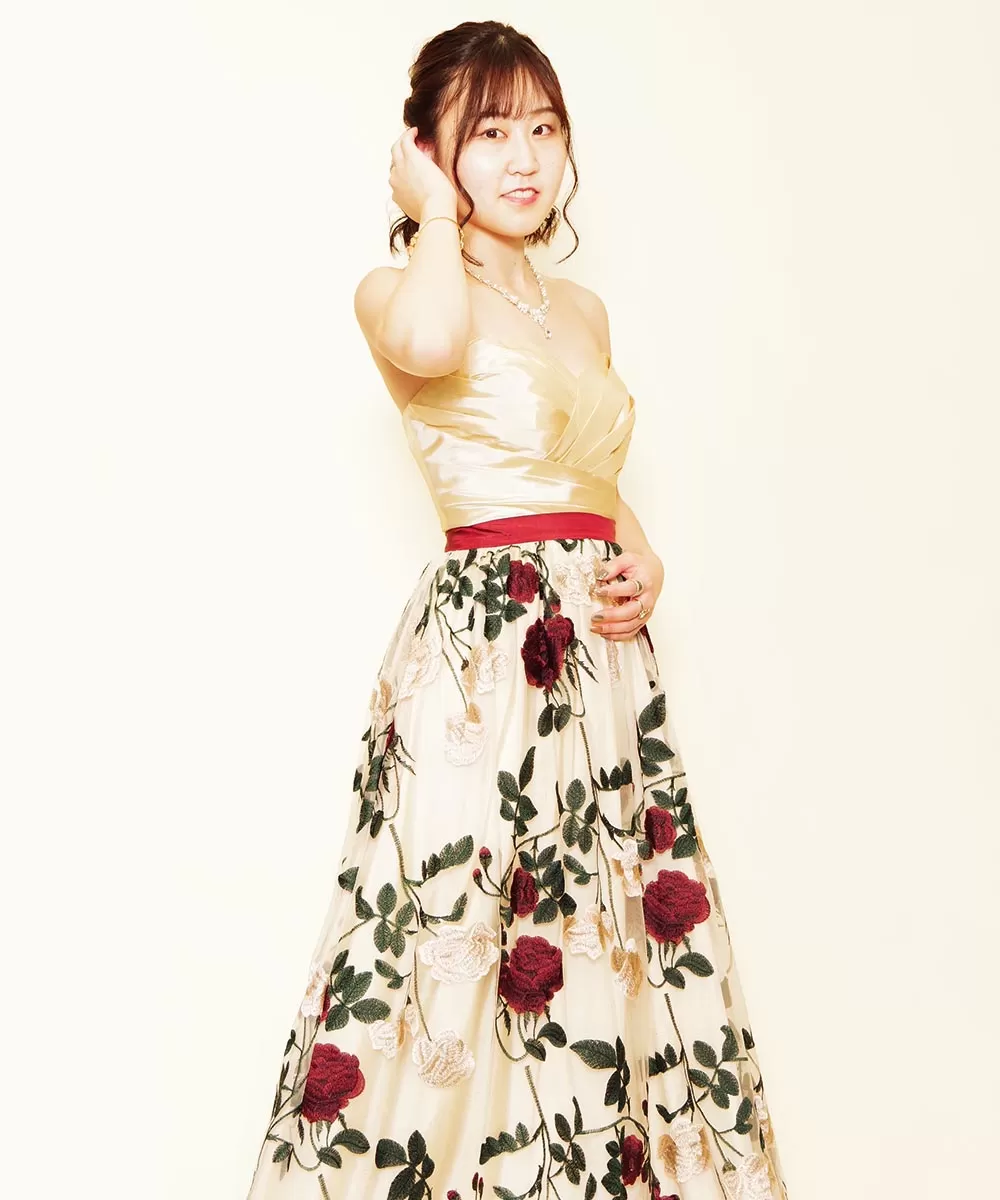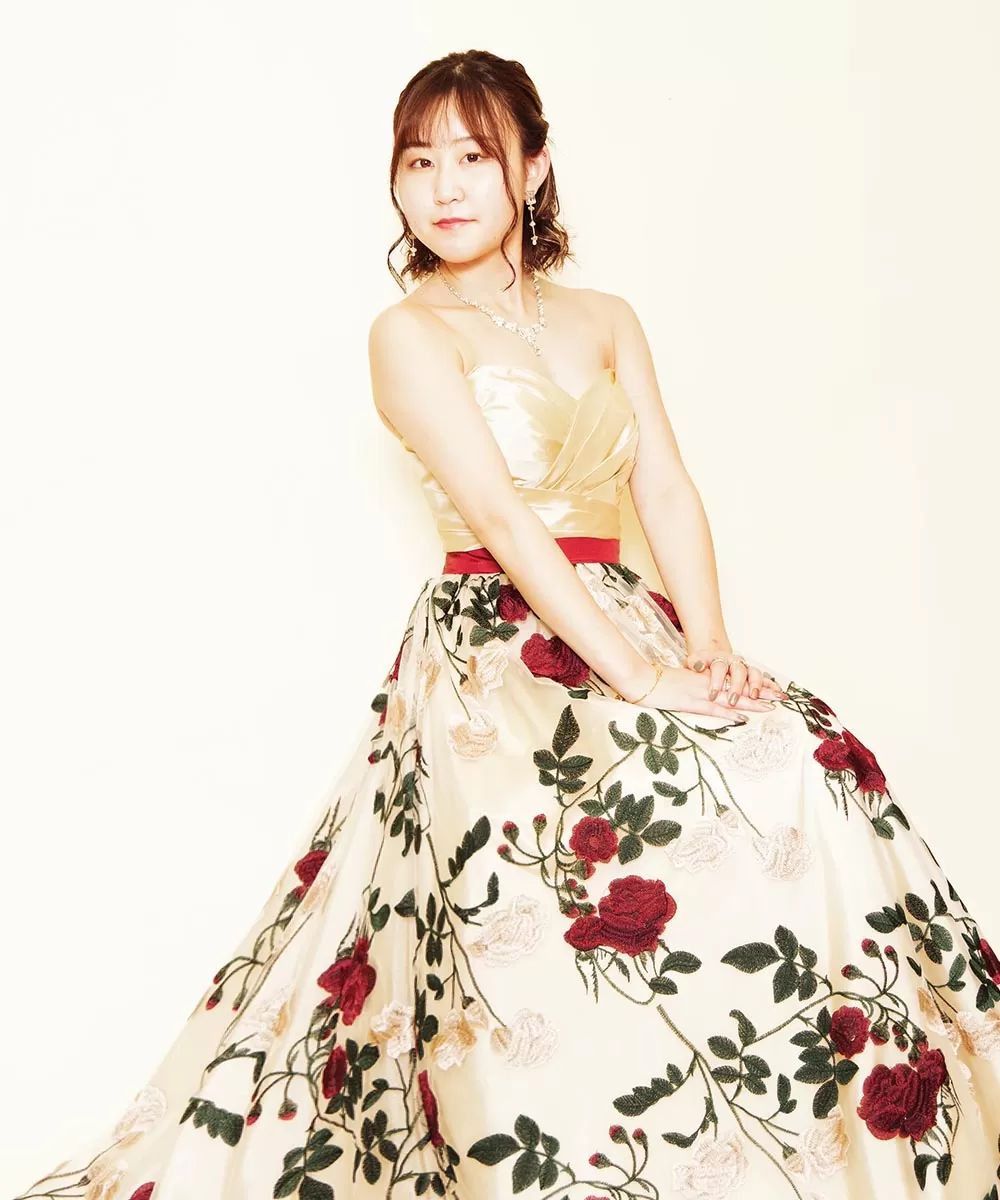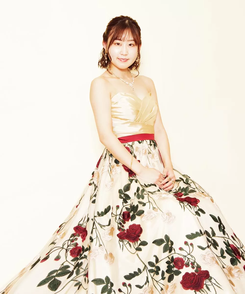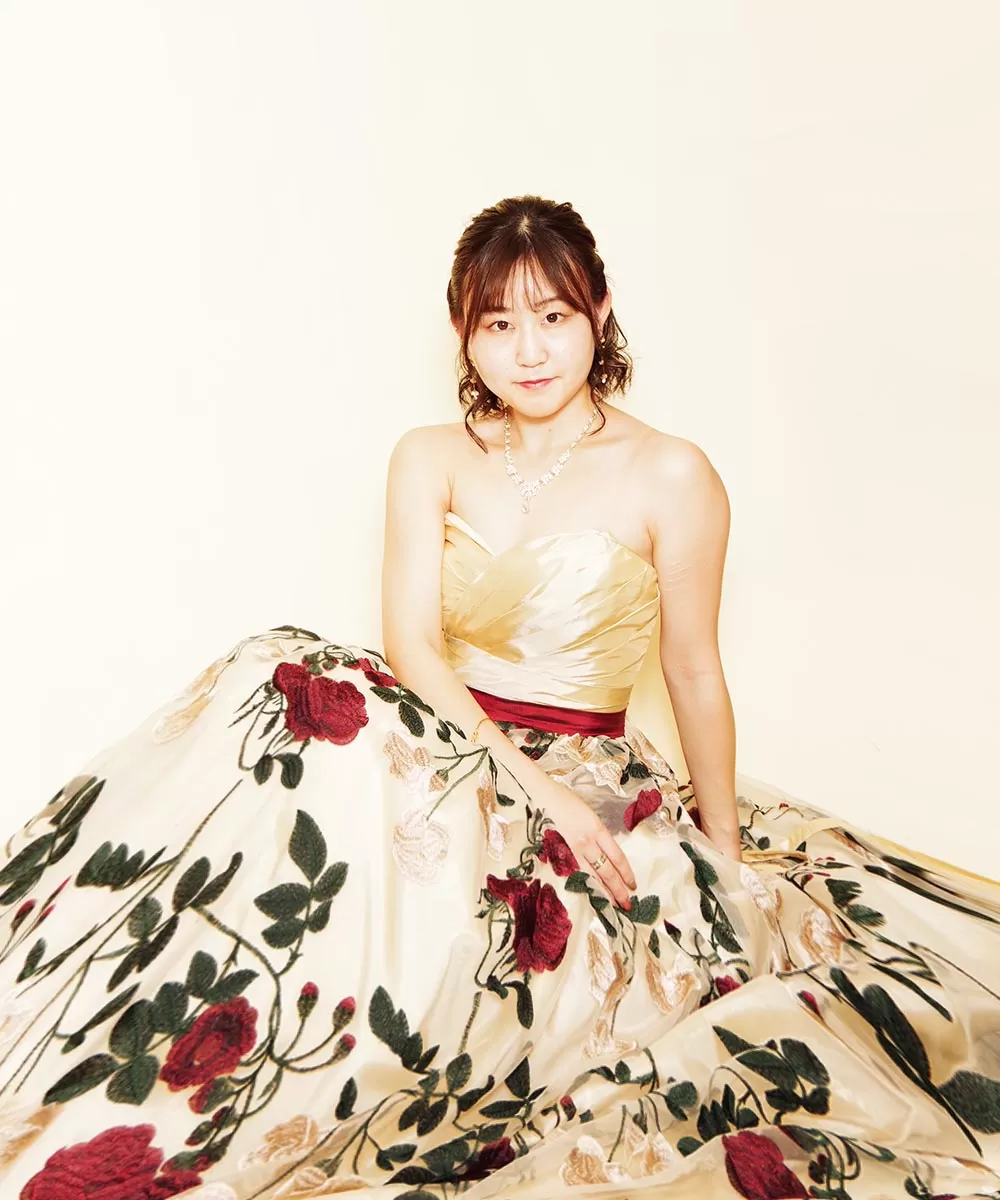 ドレスルームアミフォトスタジオにてお貸出し中のイエローベースに花柄生地を重ね合わせたmk201をレンタル頂き撮影を行った演奏家のお客様のお写真です。