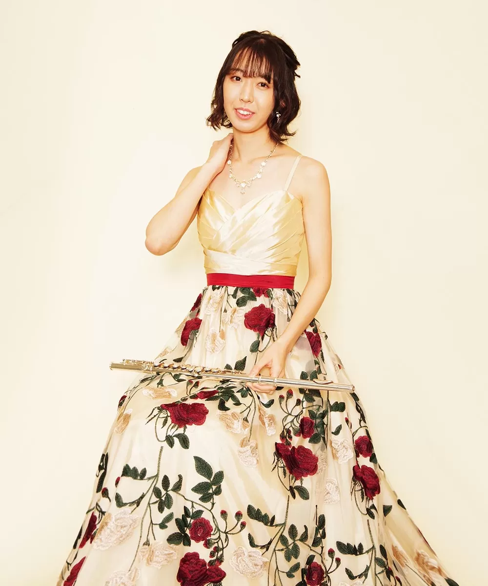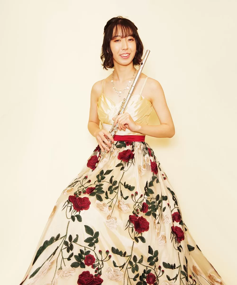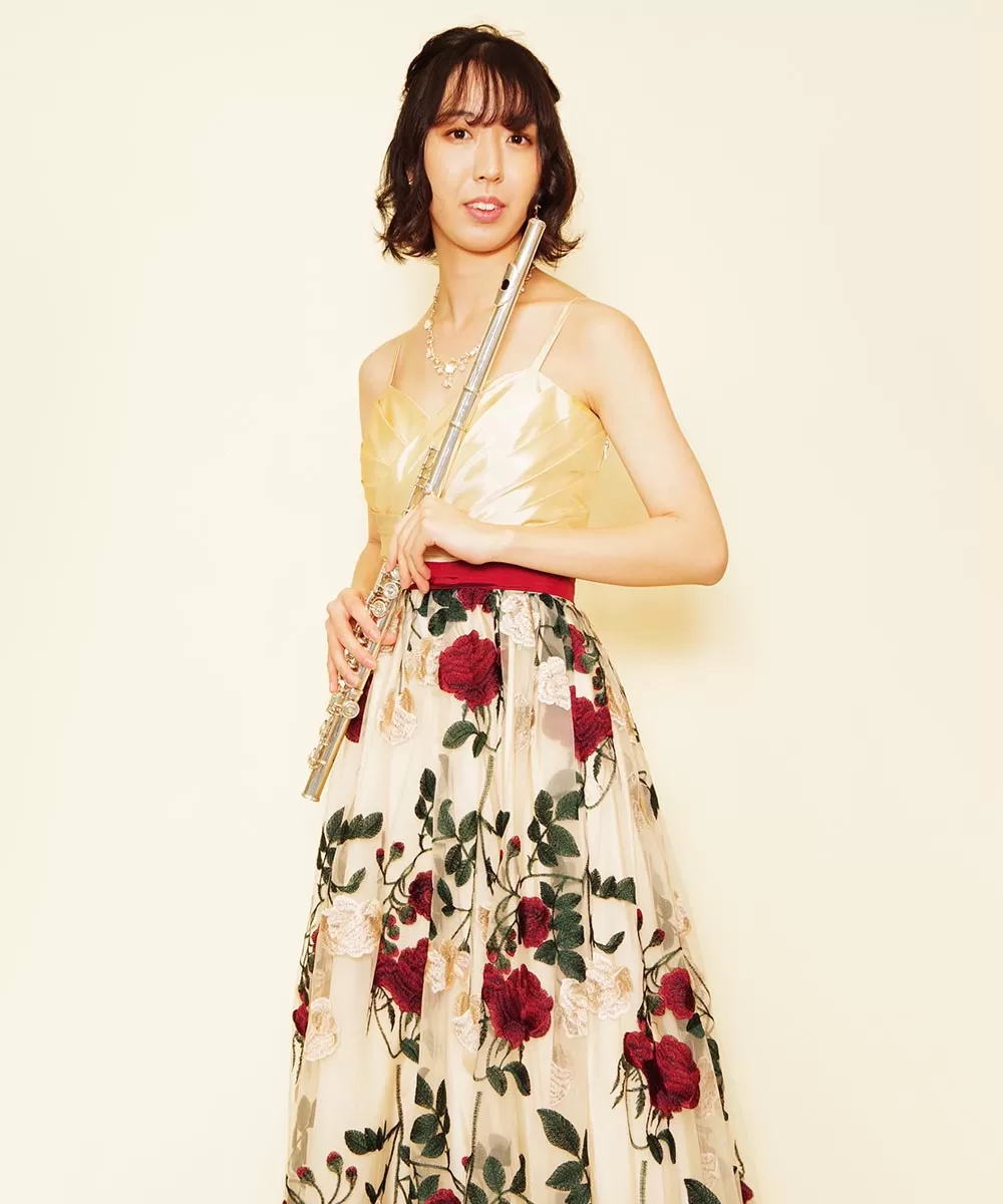 ドレスルームアミで人気の花柄ドレス、mk201を着用して撮影を行ったフルート奏者さまのお写真です。