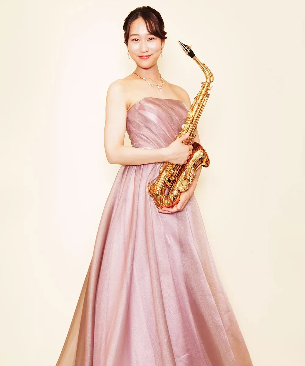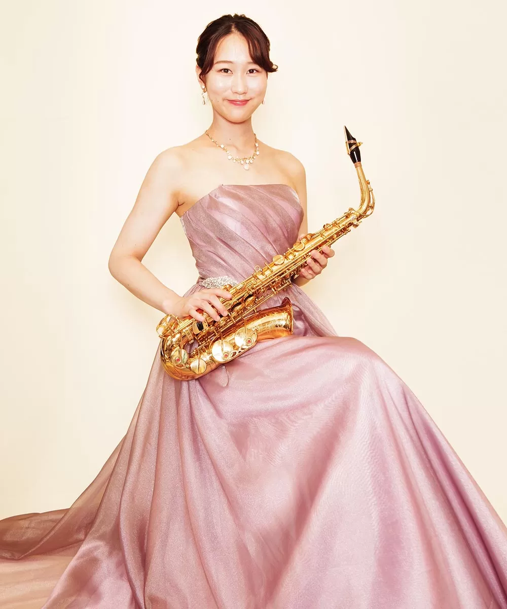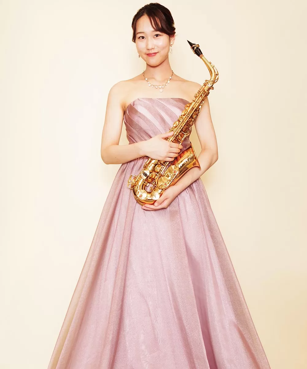 スモーキーローズピンクのオーガンジードレスを着用されたサックス奏者様のプロフィール写真