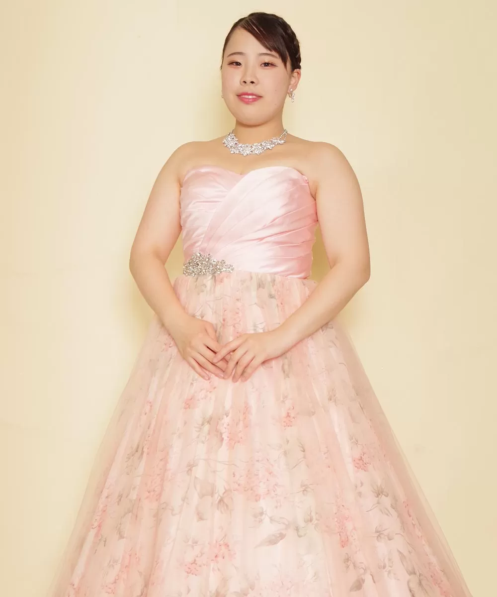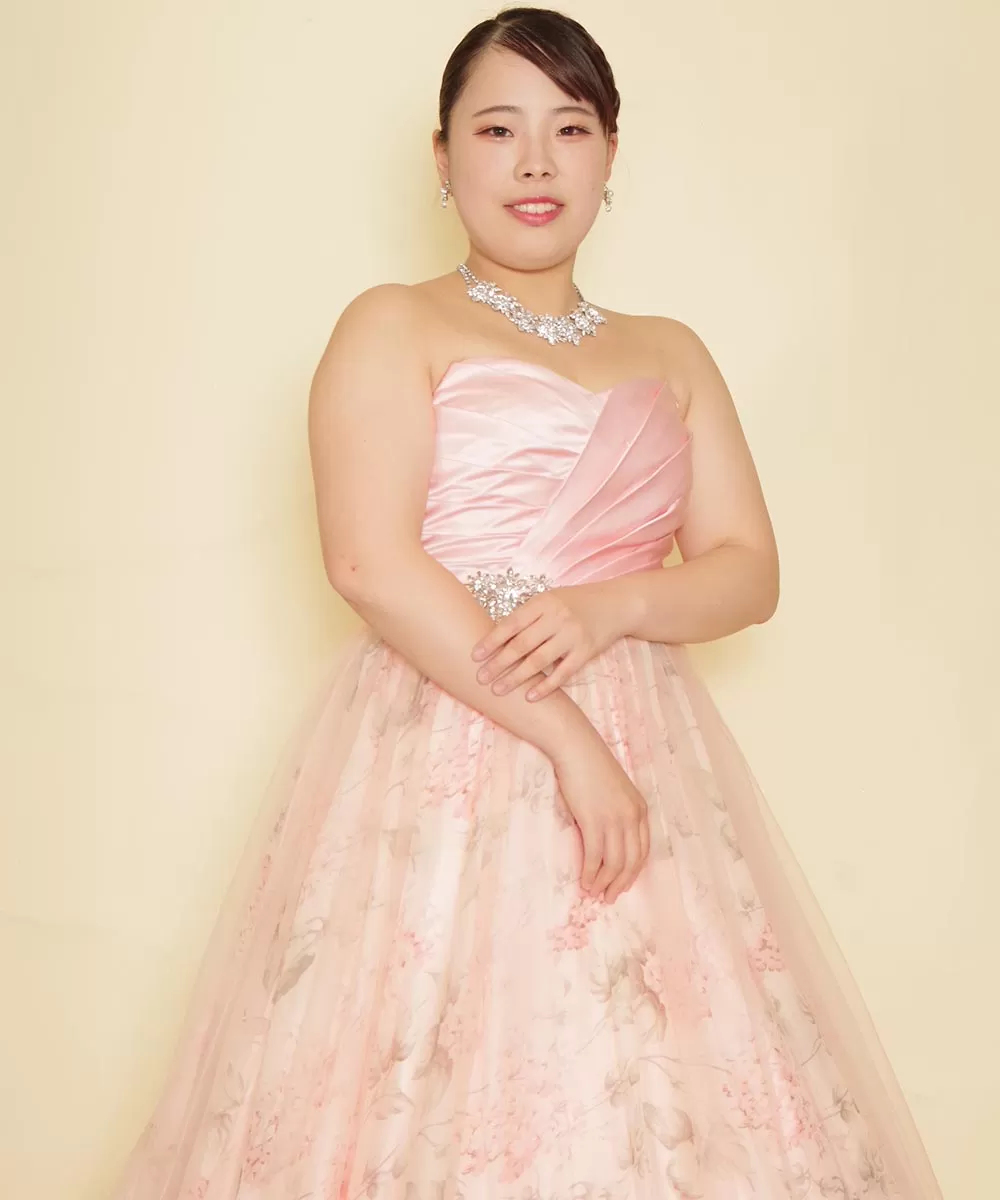 お客様を主役に据え、ピンクの花柄が施された豪華なドレスを着用した姿を柔らかく自然な光で美しく捉えました。