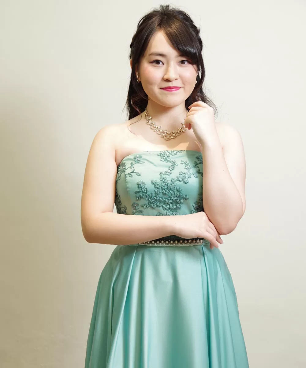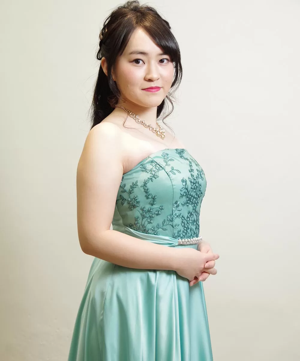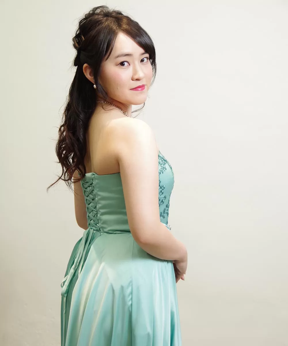 今回撮影したプロフィール写真では、いつもと少し違った雰囲気でドレスをなびかせるように動いてもらいながらシャッターを連写することで、動きのある写真も取り入れてみました。写真全体にグッと動きがことによってインパクトが出ますので、コンサートのチラシで使用するお写真として活用いただけるかと思います。今回着用されているドレスルームアミのロングドレスは光沢感のあるサテン生地を使ったドレスですので、動きを着けたときの光沢感も美しく出ています。