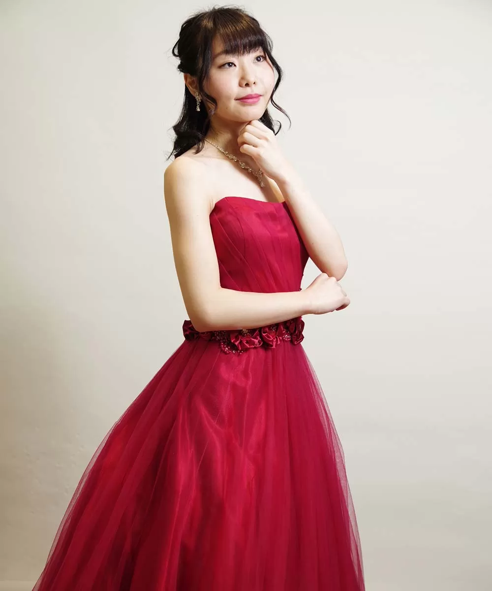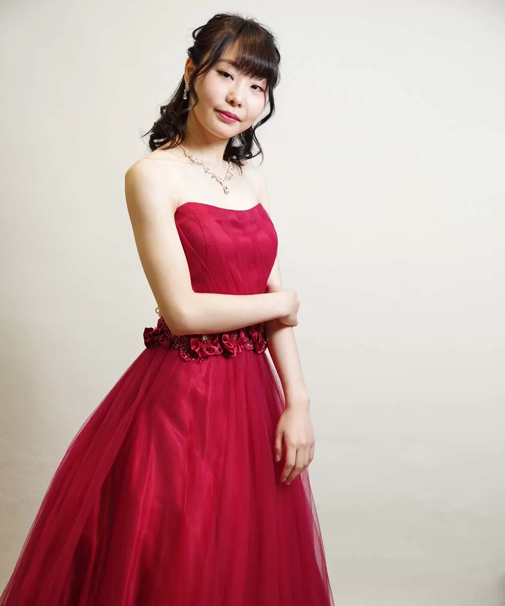 今回ご来店いただいたお客様にドライフラワーを無料でお貸し出しさせて頂き、演奏会でご使用される宣材写真の撮影を行ないました。小道具を使うことで、写真の世界観が一気に変わります。変化を加えた写真を収めたいお客様にはとても効果的な撮影方法なので、ぜひお気軽にお申し付けください。今回使用しているドライフラワー以外にもご用意がございます。また、今回ご着用いただいているカラードレスもドレスルームの商品です。レッドの色味がとても綺麗に出ている一着で、明るく華やかなコンサートにとても最適です。