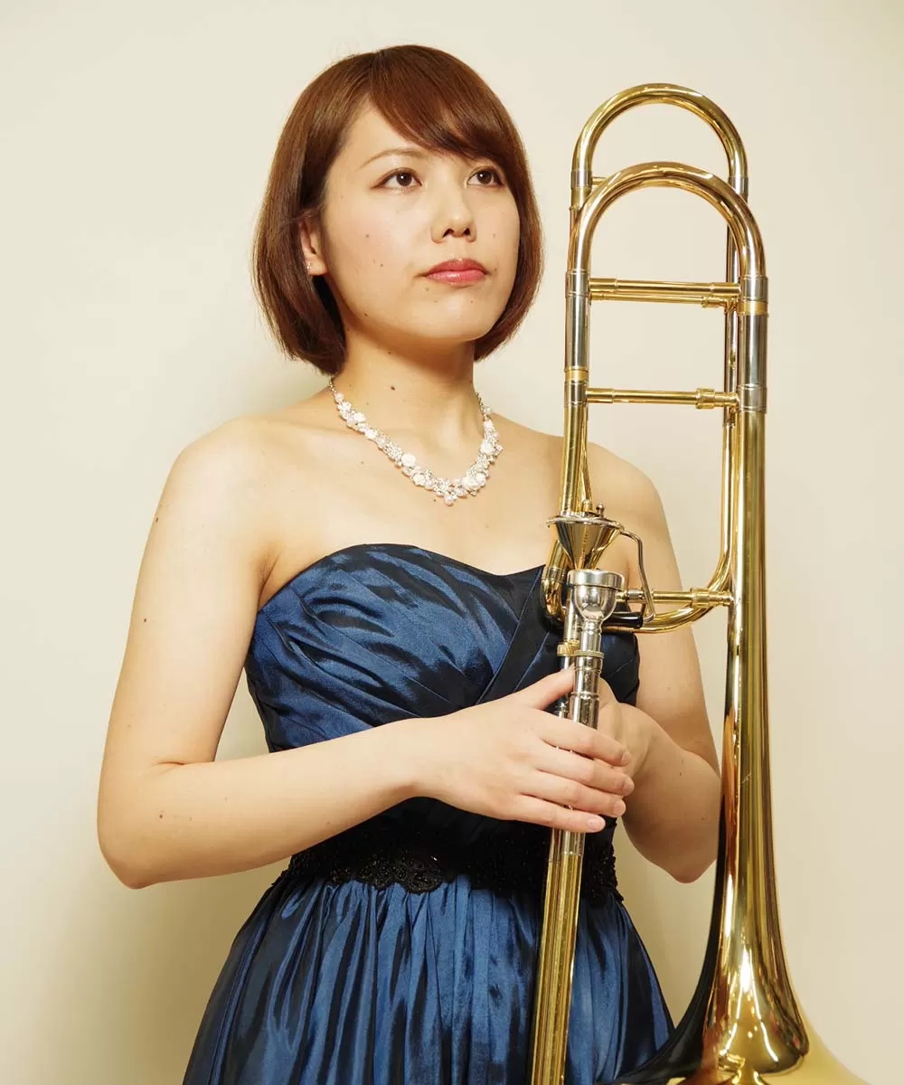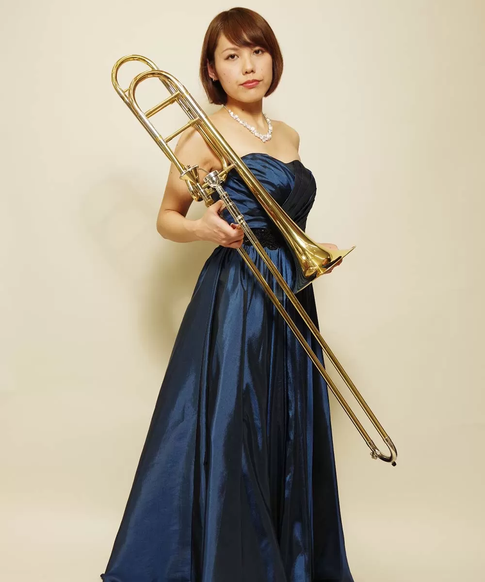 ネイビーのカラードレスを着用したトロンボーン奏者様の宣材写真