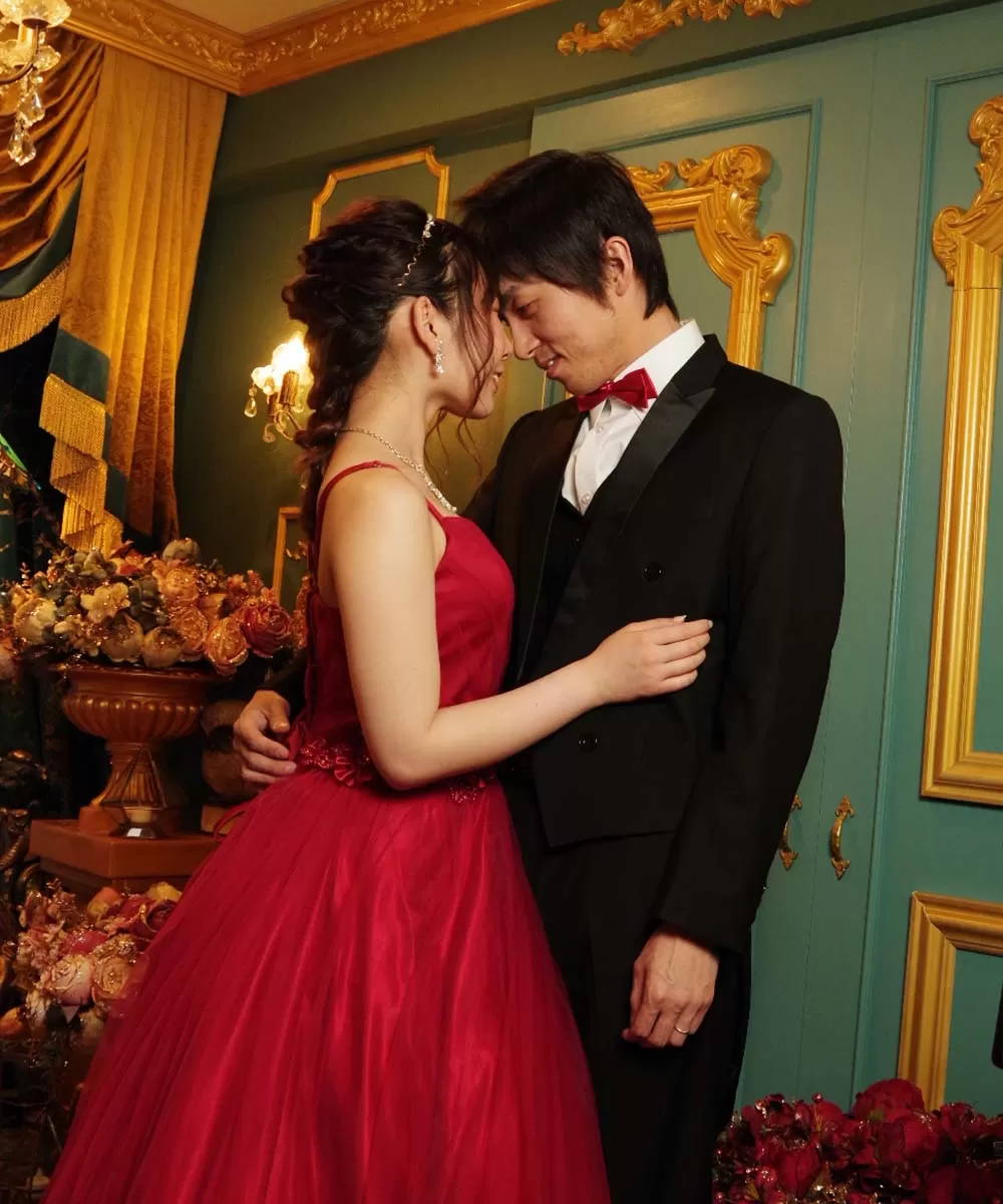 レッドのドレスを着用しての新宿で撮影した結婚式の前撮り写真