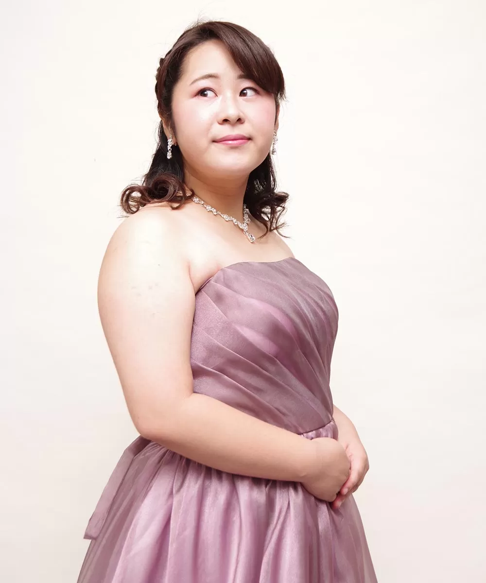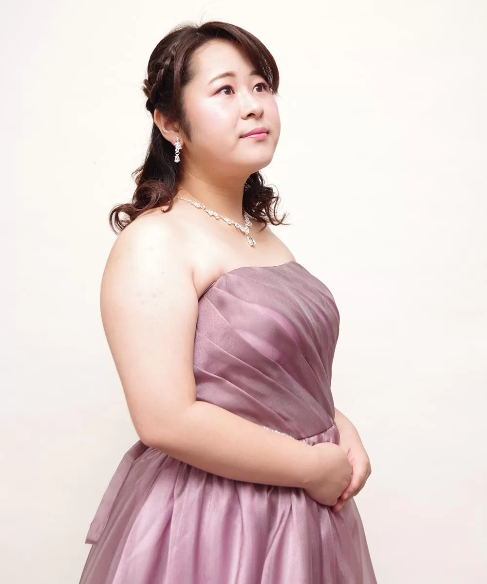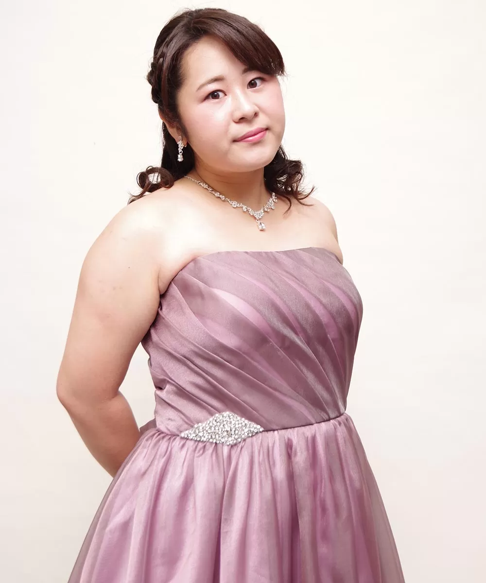 オシャレな印象を表現できることから人気を集めているダスティーパープルピンクカラーのドレスルームアミのロングドレスを着用いただいての演奏会のプロフィール写真撮影を行った際のお写真です。今回の撮影ではお客様にカットごとに視線とお顔の角度を切り替えながら撮影をさせていただきました。カメラマンが指示を出させていただきながら方向を変えましたが、事前に最も美しく見える自分の顔の角度をチェックして置くことで、より納得いく撮影ができますので、自分で鏡の前でスマホで撮影してベストな角度を理解しておくことをオススメいたします。ちなみに今回の撮影では、視線を変える際にカメラマンが指を伸ばして、その指先に顔と視線を向けていただく形で撮影を進めました。