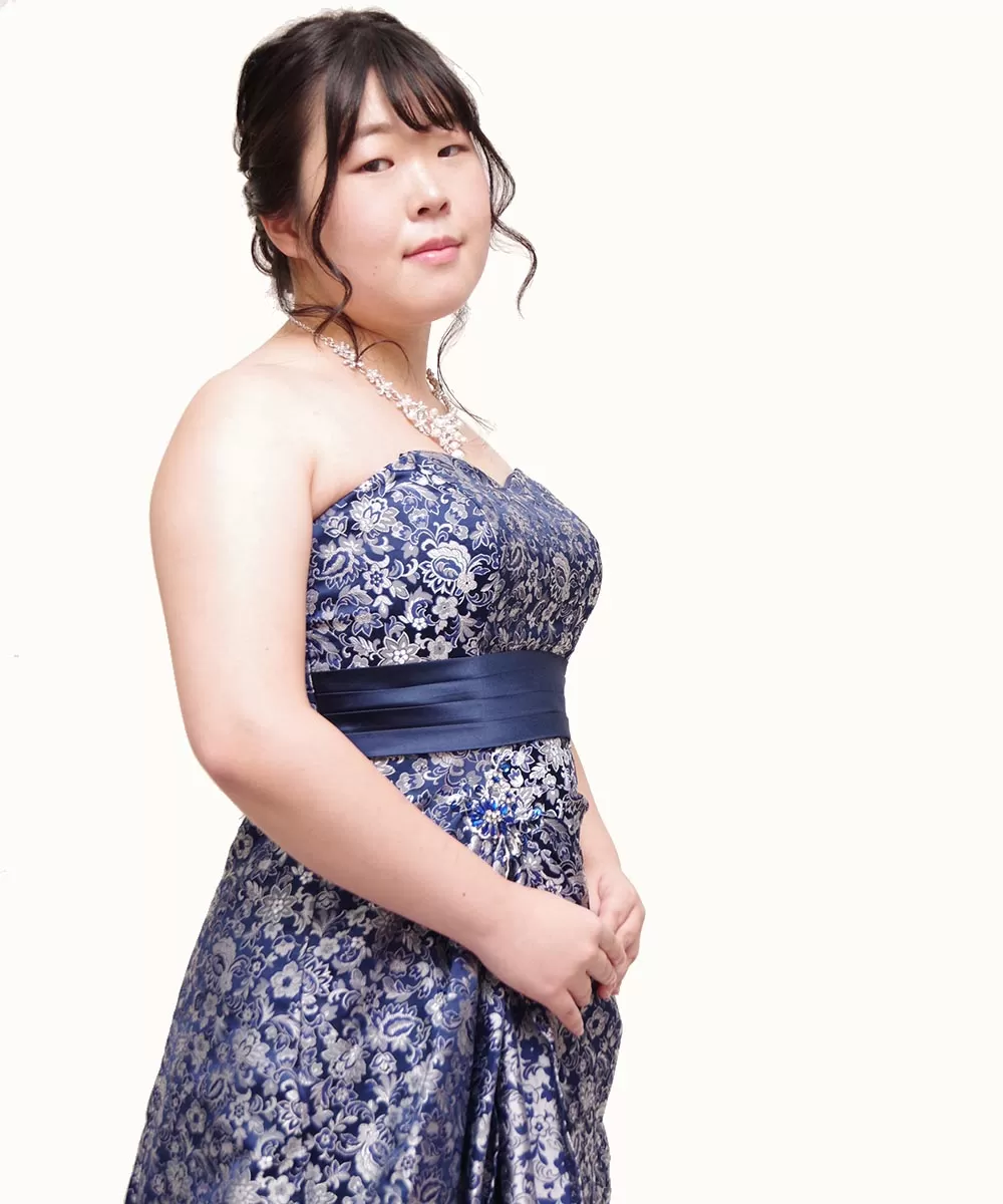 ドレスルームアミで人気の高級なジャガード生地をふんだんに使用したネイビーカラーのドレスを着用されてのプロフィール写真撮影を担当させていただきました。このドレスは撮影の際のフラッシュも美しく反射する光沢感のある刺繍になっているので、演奏会で使う衣装としてだけでなくコンクールの宣材写真での着用もオススメです。今回のお客様は撮影前に美容室でヘアメイクをされてからご来店いただきましたが、髪の毛のセットは宣材写真撮影の際にはとても重要です。特にロングヘアの方の場合、その差は大きく出ます。プロフィール写真は一度撮影したものを永く使われる場合が多いですので、少し手間かもしれませんが、しっかりヘアメイクも撮影前に行って、より素敵な写真を収めてみてください。