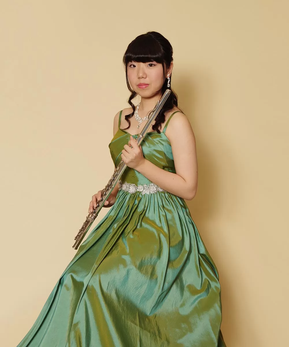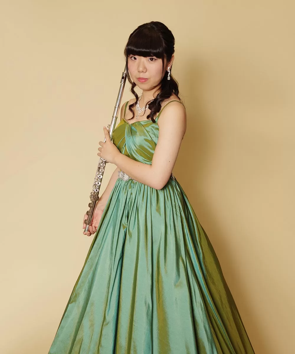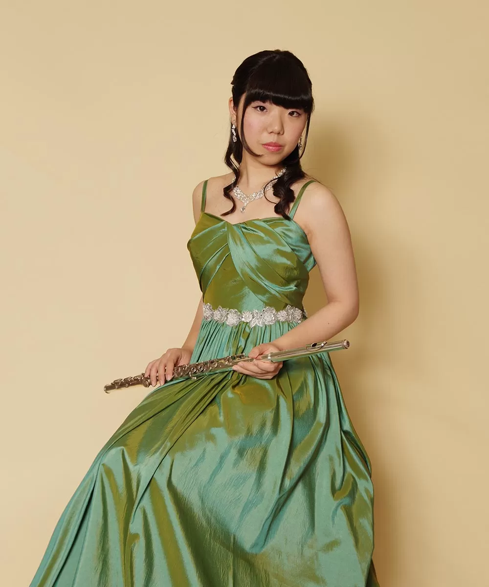 幻想的な光を放つタフタ生地のグリーンカラードレスを着用されてのフルート奏者様の宣材写真