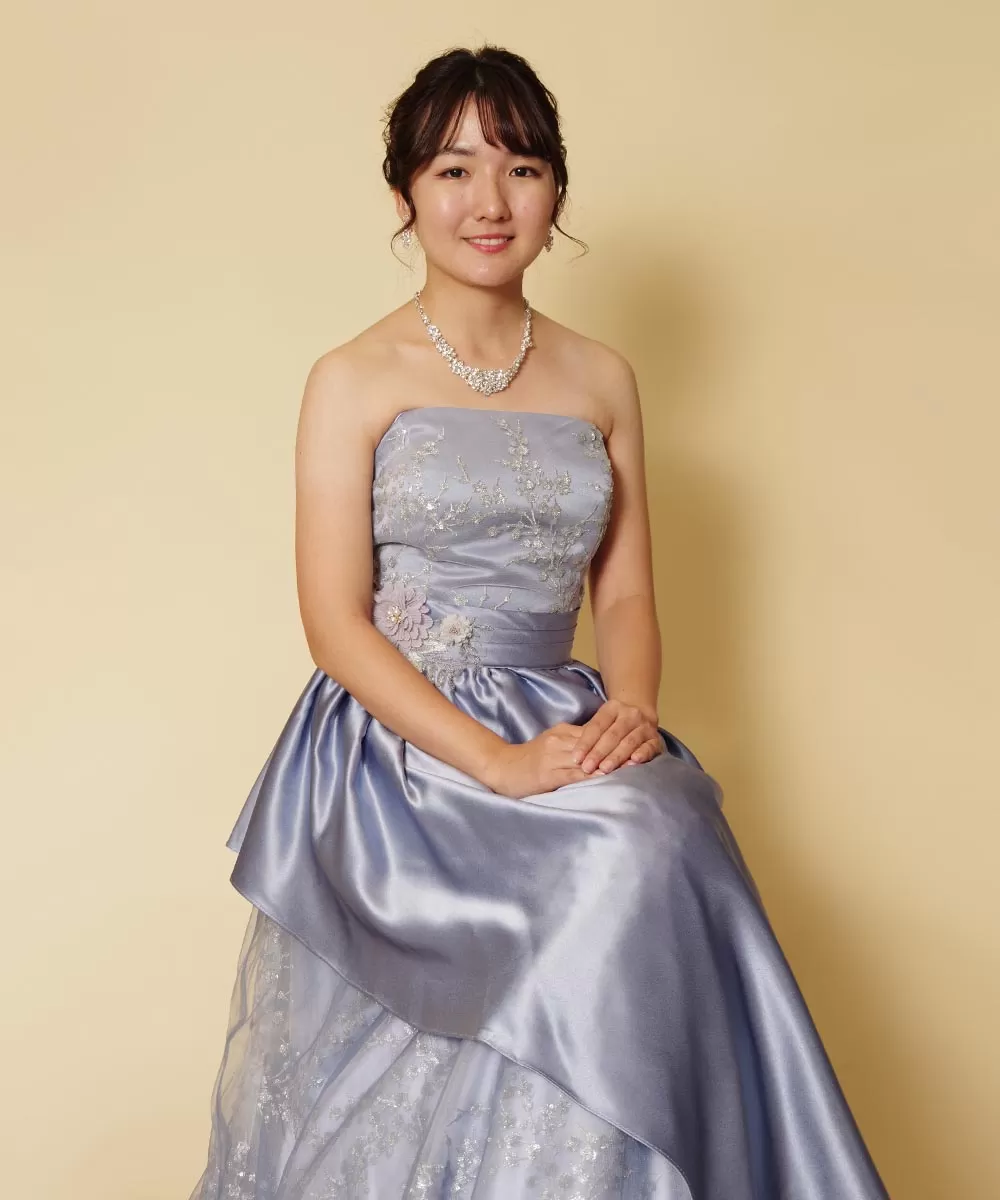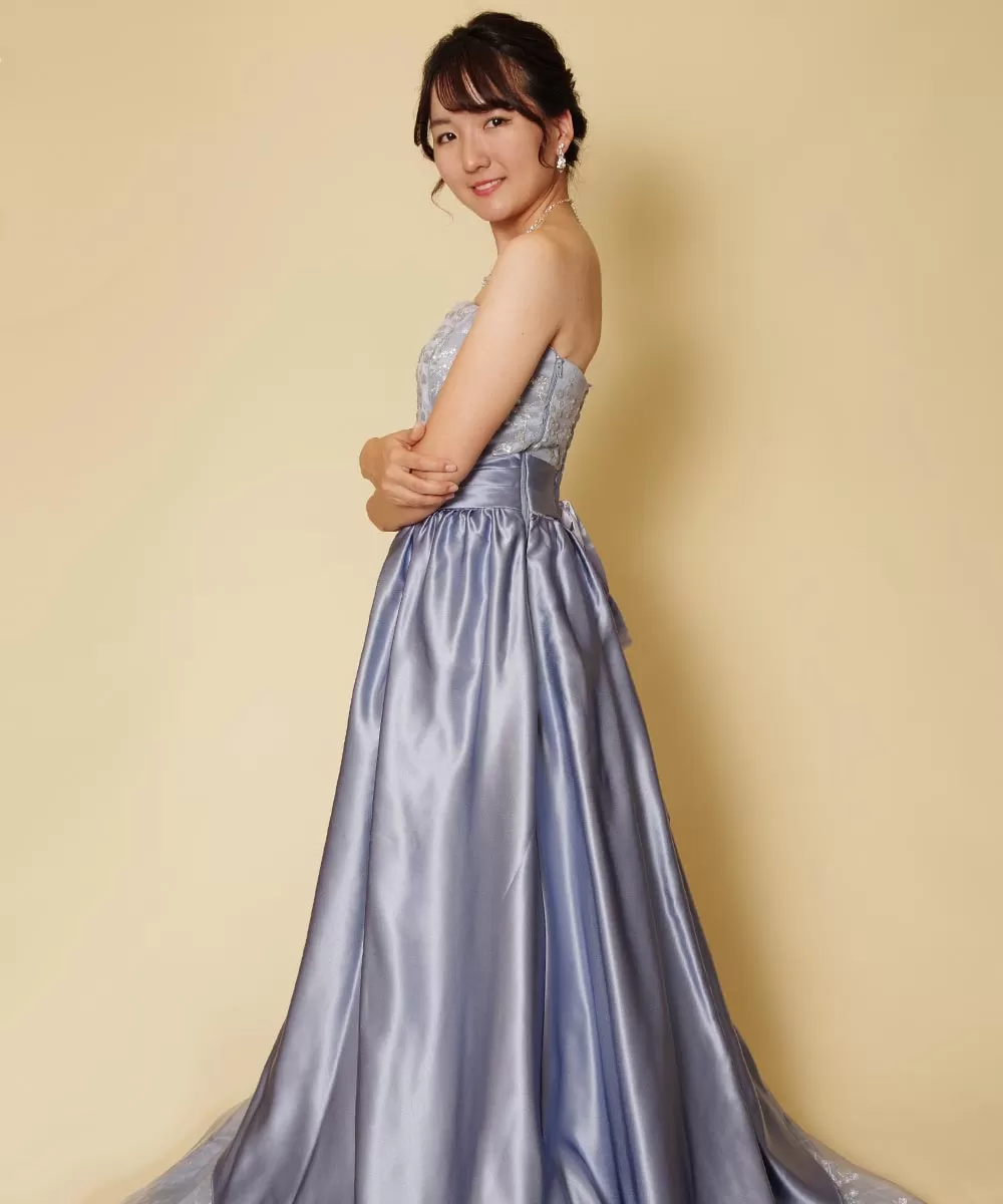 キラキラスカイブルーのロングドレスを身にまとった演奏家のお客様の宣材写真