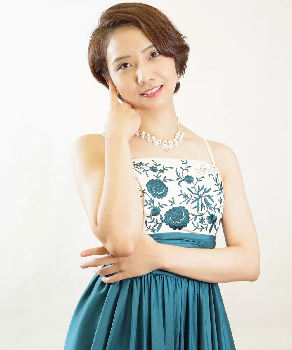 ピアニストのお客様のエメラルドグリーンのドレスを着用した宣材写真